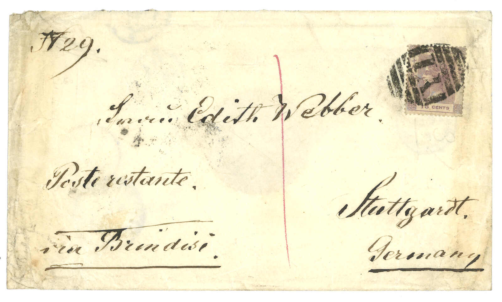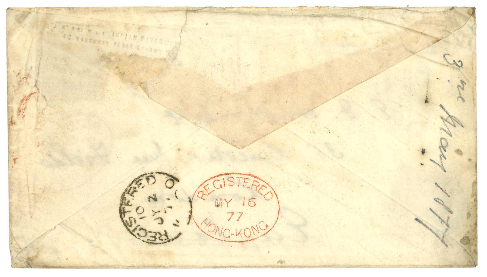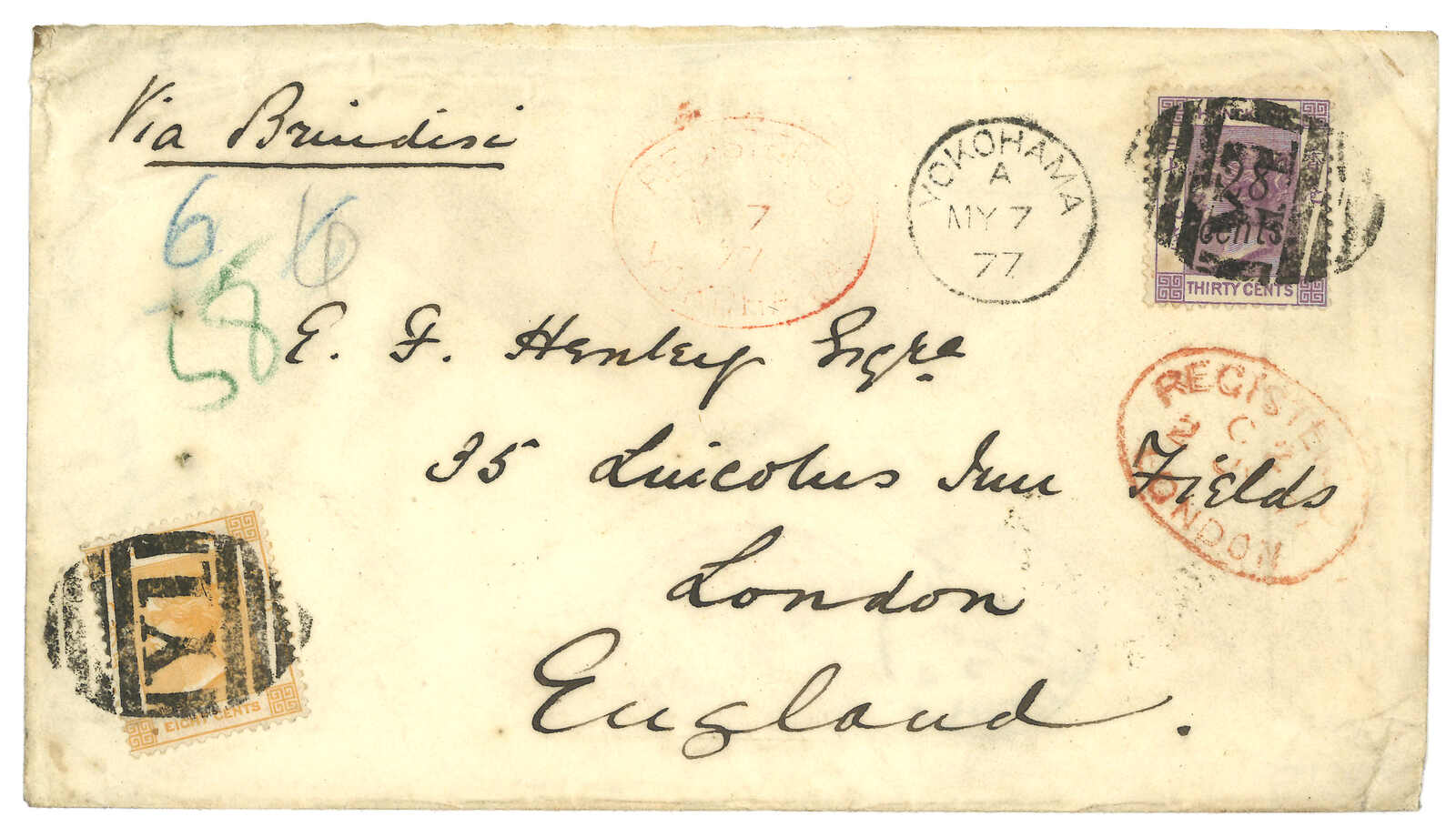 1877.5.7 橫濱經布林迪西寄英國,右上貼香港維多利亞女皇像第一次改值28仙蓋30仙(楊目21),左下貼8仙,銷Y1黑色殺手戳,另鈐橫濱英局日戳及極稀罕之Webb D型橫濱英局橢圓形掛號日戳。5.16經香港,同樣鈐橢圓形掛號日戳。7.2抵英國。此為Webb記錄中橫濱英局橢圓形掛號日戳之孤例。 Ashton舊藏。 Webb《Hong Kong and the Treaty Ports of China and Japan》Plate 54原件。 《Yokohama “Y1” Registered covers (revised August 2011)》圖例原件 2011.8.7 香港Dynasty Auction,落鎚價達25萬港元。(Image 1) (Image 2)