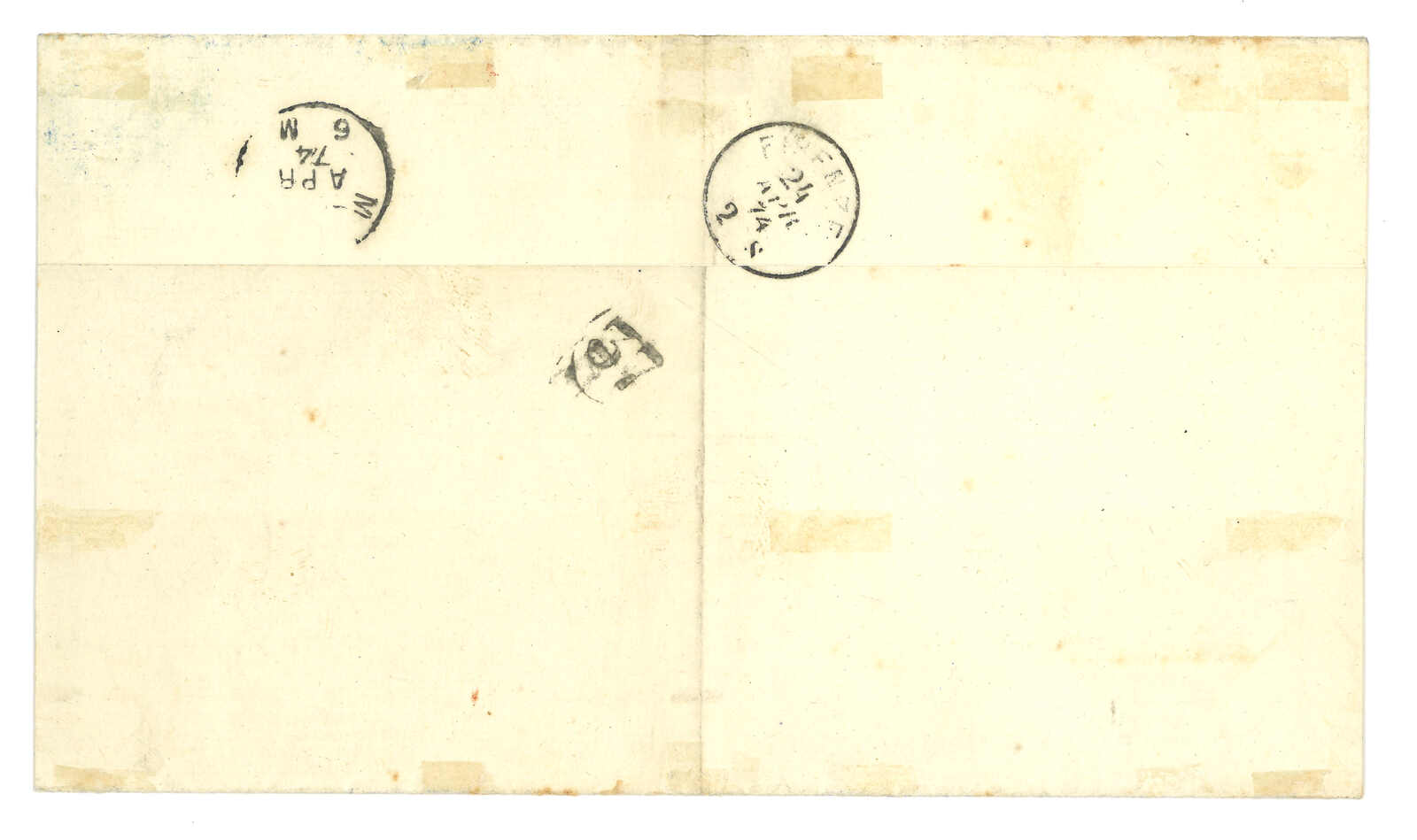 1874年印刷品自橫濱經布林迪西寄意大利,貼香港維多利亞女皇像2仙帶右寬邊,銷Y1紫色殺手戳,旁蓋PD章。4.24經佛羅倫斯。同月抵米蘭。貼2仙票之印刷品封Webb記錄僅有一件。由於印刷品在當時視為不值得保留,故存世至今者罕。(Image 1) (Image 2) (Image 3)