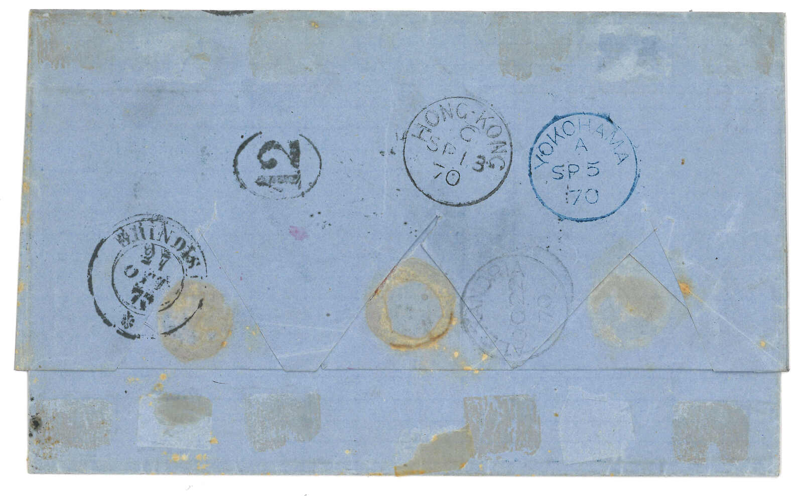 2527 cover image1870 Yokohama (8 Aug) to England. Entire letter, f.w. Hong Kong QV 12c + 4c + 8c, tied by Y1 obliterator in violet, matching with Yokohama BPO cds on reverse. Transit Hong Kong. via US packet to UK rate.