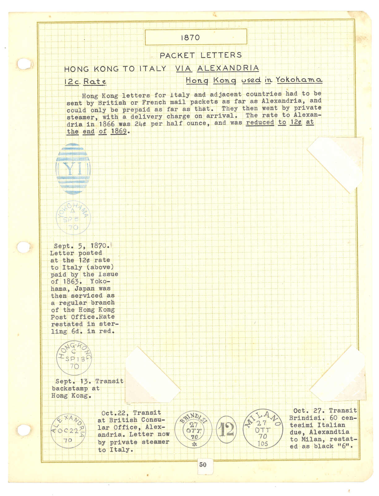 1870.9.5 橫濱寄意大利。郵簡,寫有“via Brindisi”及“6”郵資,貼香港維多利亞女皇像12仙,銷Y1紫色殺手戳,背蓋有橫濱英局日戳。9.13經香港,10.22經亞歷山大,10.27經布林迪西。由於12仙僅為寄亞歷山大郵資,故加貼意大利欠資票60分以付餘款,銷米蘭10.27到達戳。(Image 1) (Image 2) (Image 3) (Image 4)