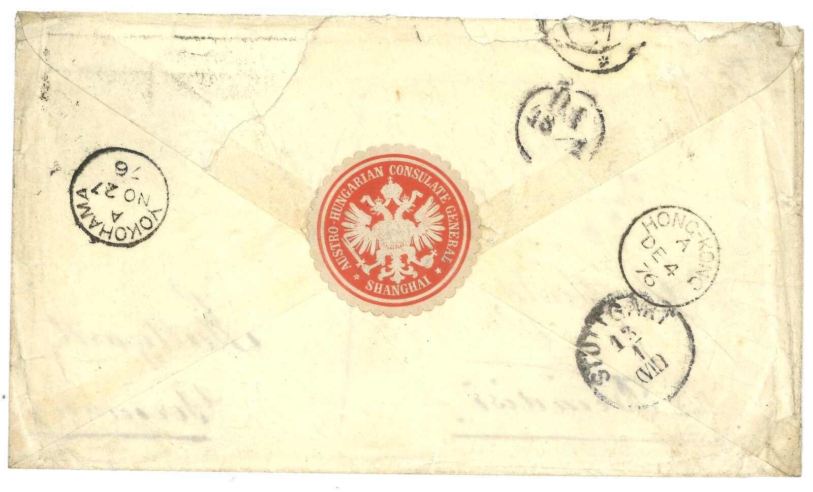 1876.11.27 橫濱寄德國,貼香港維多利亞女皇像無水印18仙(楊目4),銷Y1黑色殺手戳,背面蓋有橫濱英局日戳。手寫“1”合寄香港郵資。12.4經香港。1.13抵斯圖加特。封頂打面。背面貼奧匈帝國駐滬領事館封口紙。18仙乃法國郵船經馬賽寄英國郵資,自1876年1月27日生效,少見。(Image 1) (Image 2)