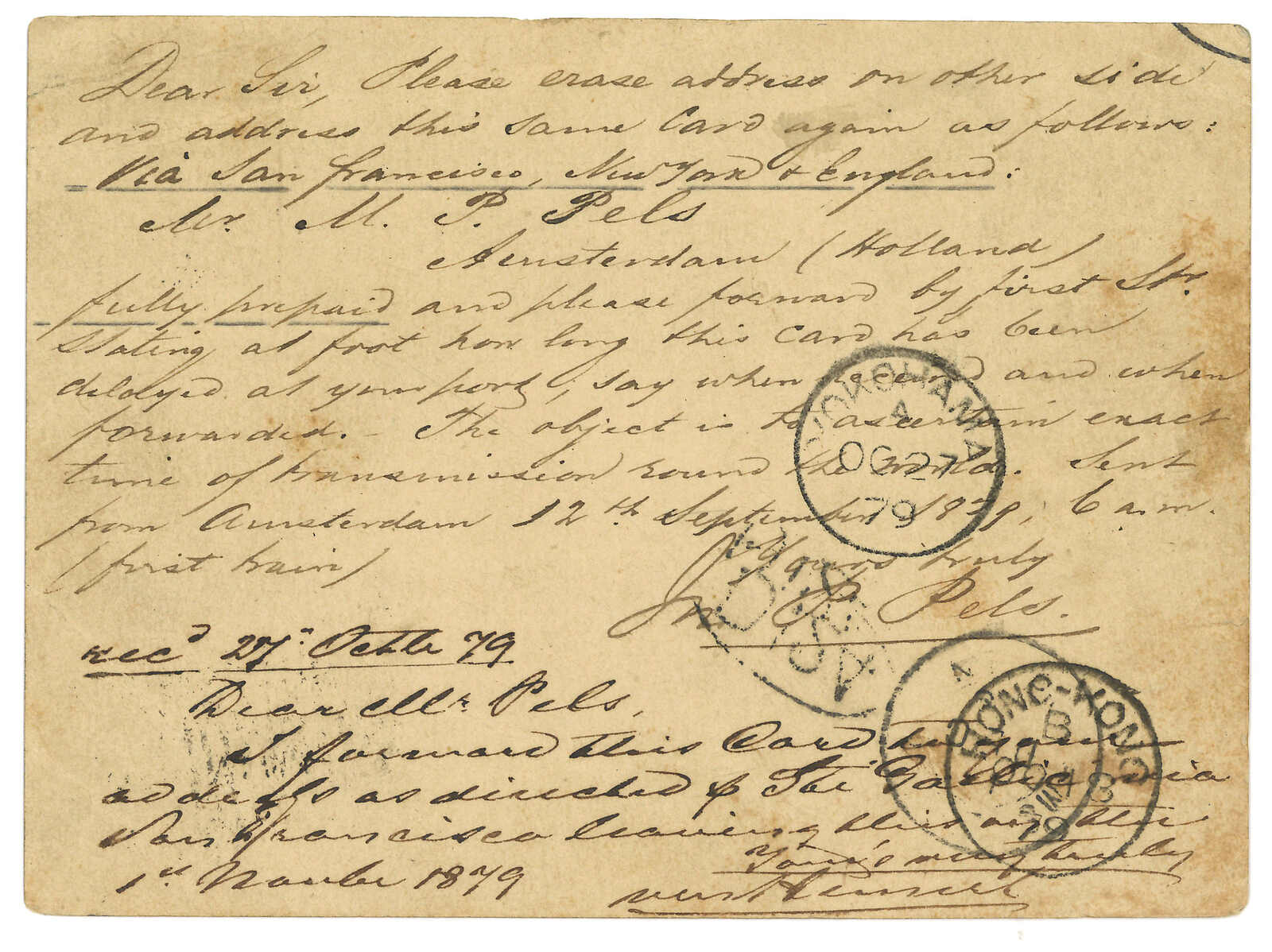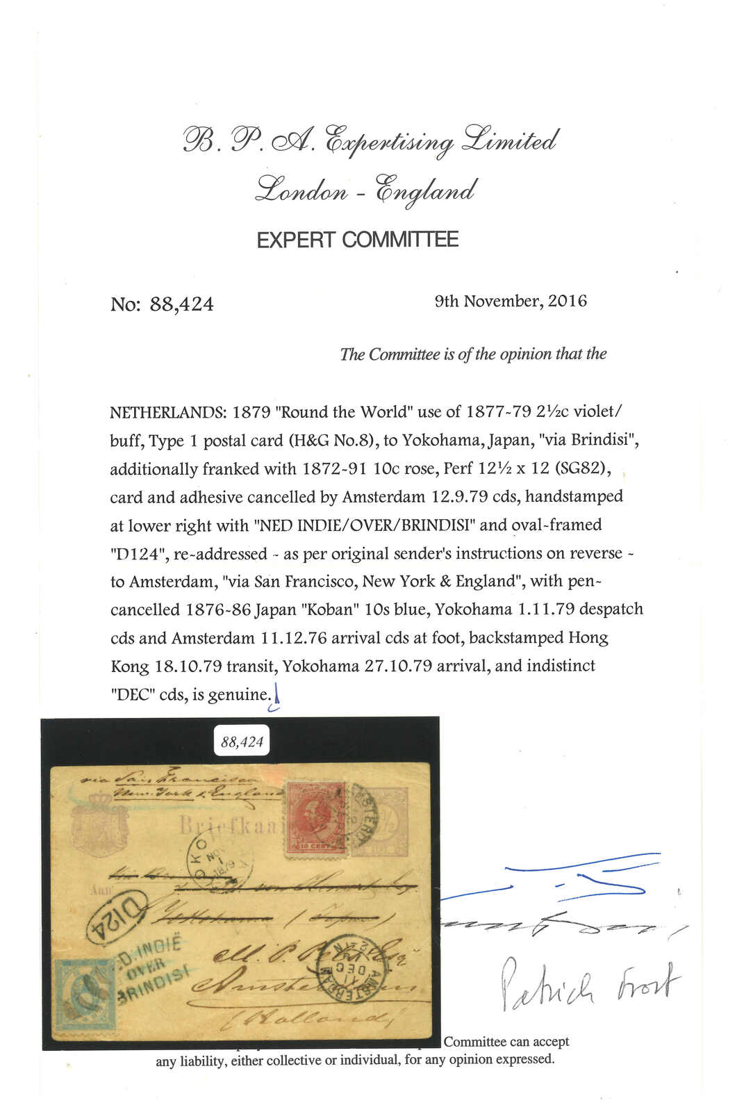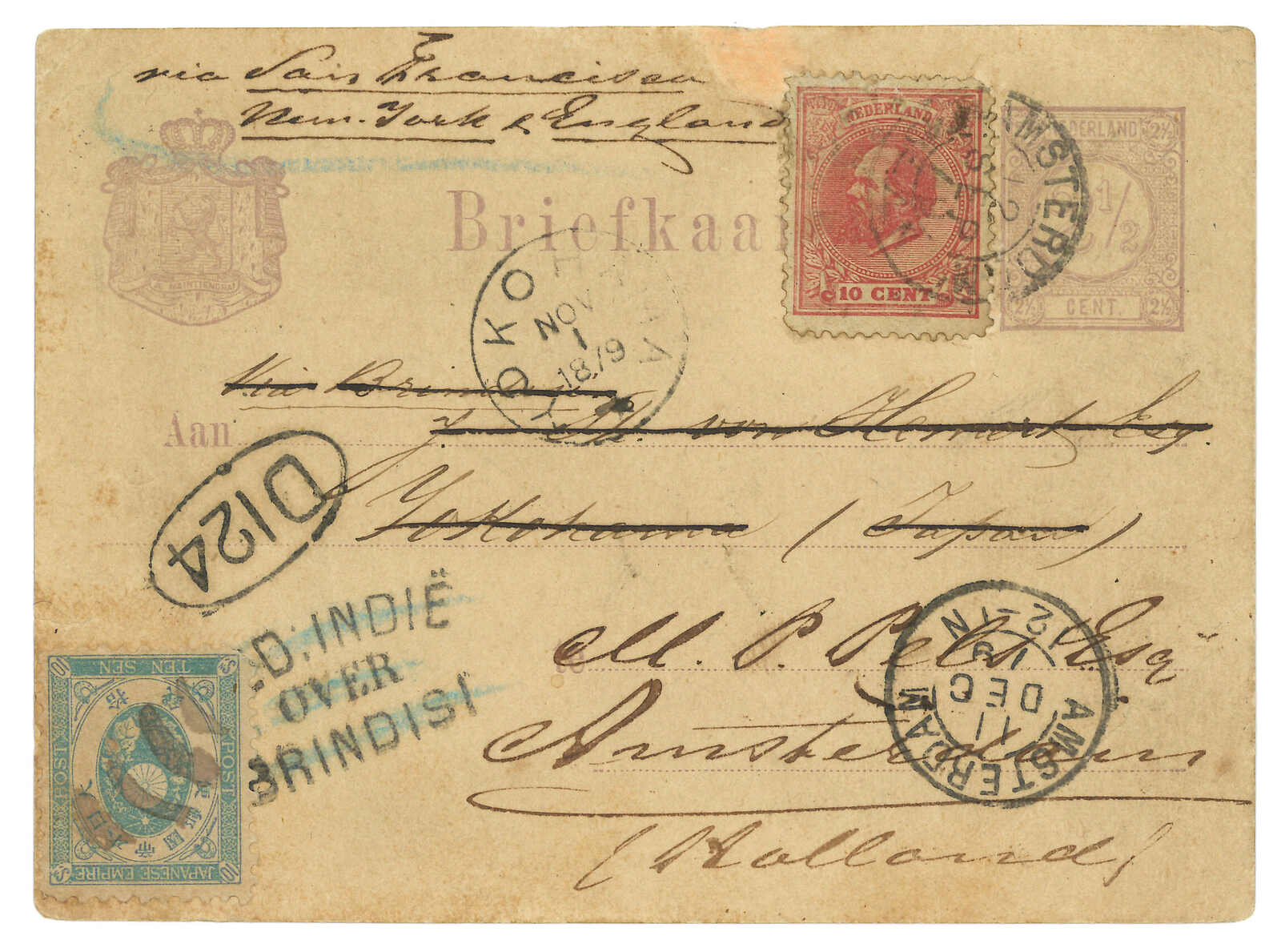 1879.9.12 “環遊世界”荷蘭2-1/2分郵資片,加貼10分,銷阿姆斯特丹日戳。寫有“via San Francisco, New York & England”批示、“Ned Indie / Over / Brindisi”橫戳及橢圓形D124戳記。10.18經香港。10.27抵橫濱英局,寄回阿姆斯特丹,貼日本小判10錢,旁鈐橫濱英局11.1日戳。附BPA證書。(Image 1) (Image 2) (Image 3)
