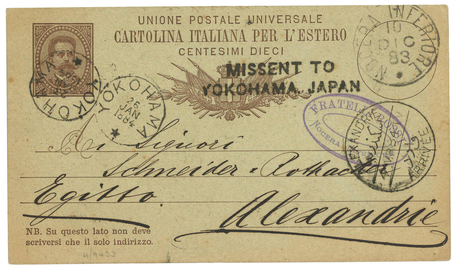 2551 cover image1883 (10 Dec) Italian postal card to Egypt, missent to Yokohama, applied with Nocera Inferiore cds and oval "Fratelli Rossi" seal. Missent to Yokohama (26 Jan) with "MISSENT TO YOKOHAM JAPAN" cachet. Redirected to Alexandrie via Hong Kong (4 Feb), Suez (3 Mar). Interesting and scarce. Webb only recorded one example of this missent h.s. on a 1881 cover from Spain to Bombay.