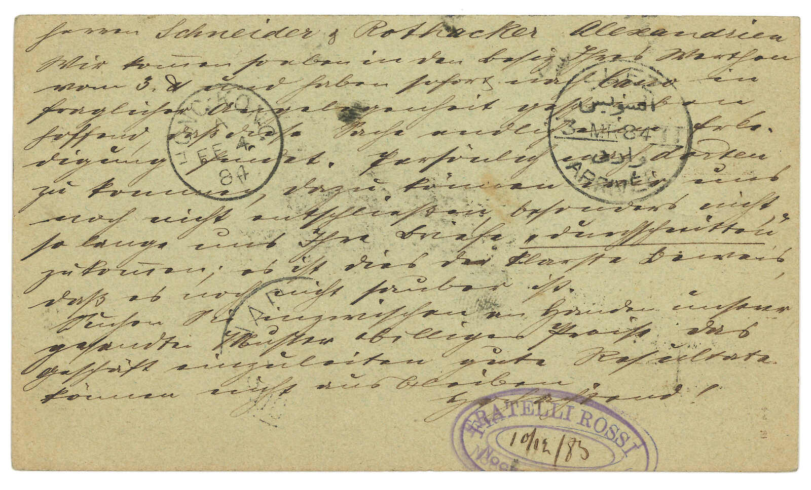 1883.12.10 意大利明信片寄埃及,誤寄橫濱,銷Nocera Inferiore日戳及“Fratelli Rossi”橢圓形戳記。1.26誤抵橫濱,鈐“MISSENT TO YOKOHAMA JAPAN”橫戳。改寄回亞歷山大,2.4經香港,3.3經蘇伊士。有趣難得。此誤寄橫戳於Webb記錄中僅見一件1881年例子。(Image 1) (Image 2)