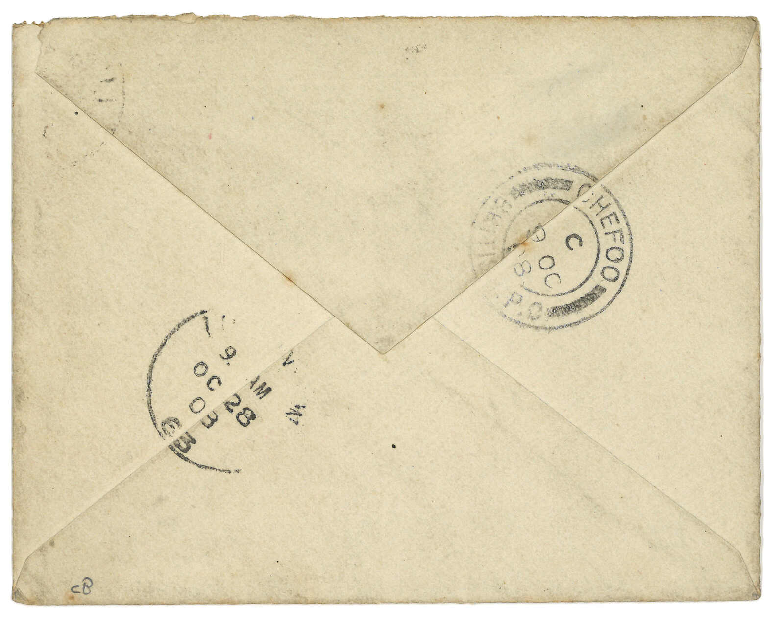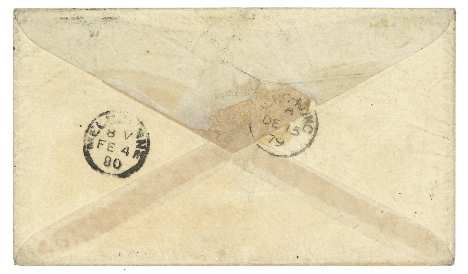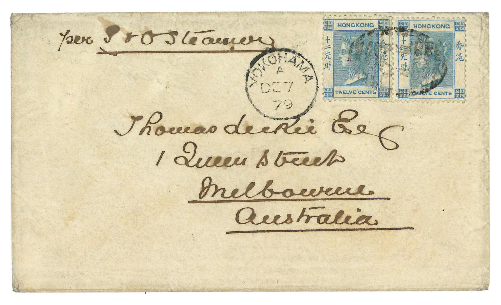2549 cover image1879 Yokohama (7 Dec) to Australia, f.w. Hong Kong QV 12c x2, tied by Y1 obliterator in black, alongside with Yokohama BPO cds. Showing "Per P&O steamer" annotation. Transit Hong Kong (15 Dec). Arrived Melbourne (4 Feb). This cover dated later than the latest record of Yokohama BPO cds by Webb (12 Nov 1879), probably the latest cover from British PO in Japan. Realized HKD$110,000.