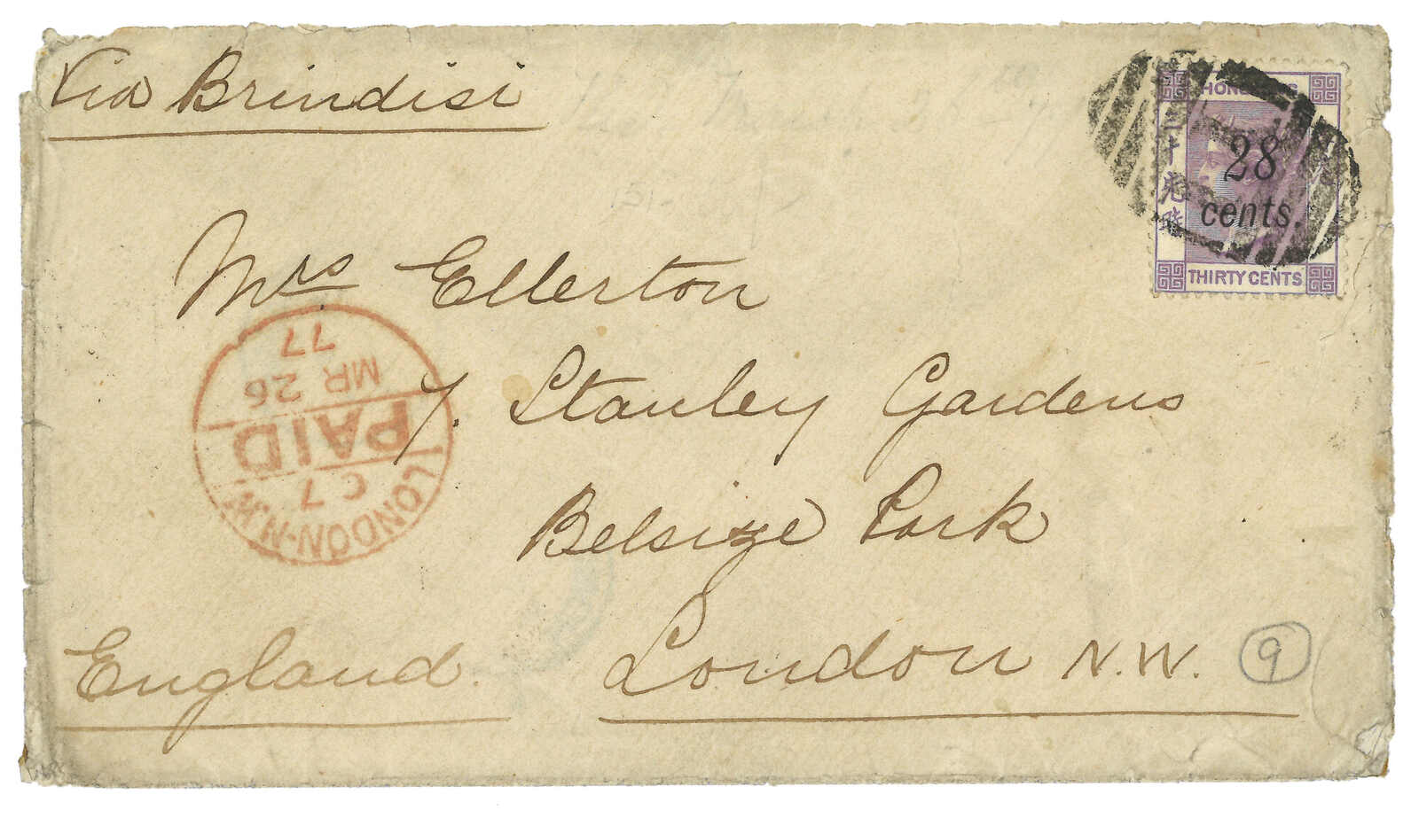 1877.2.5 橫濱經布林迪西寄英國,貼香港維多利亞女皇像第一次改值28仙蓋30仙(楊目21),銷Y1黑色殺手戳,背面蓋有橫濱英局日戳。2.12經香港,3.26經倫敦。貼票出色難得。Webb記錄中,貼有此票並從橫濱寄出者僅有一件。(Image 1) (Image 2)