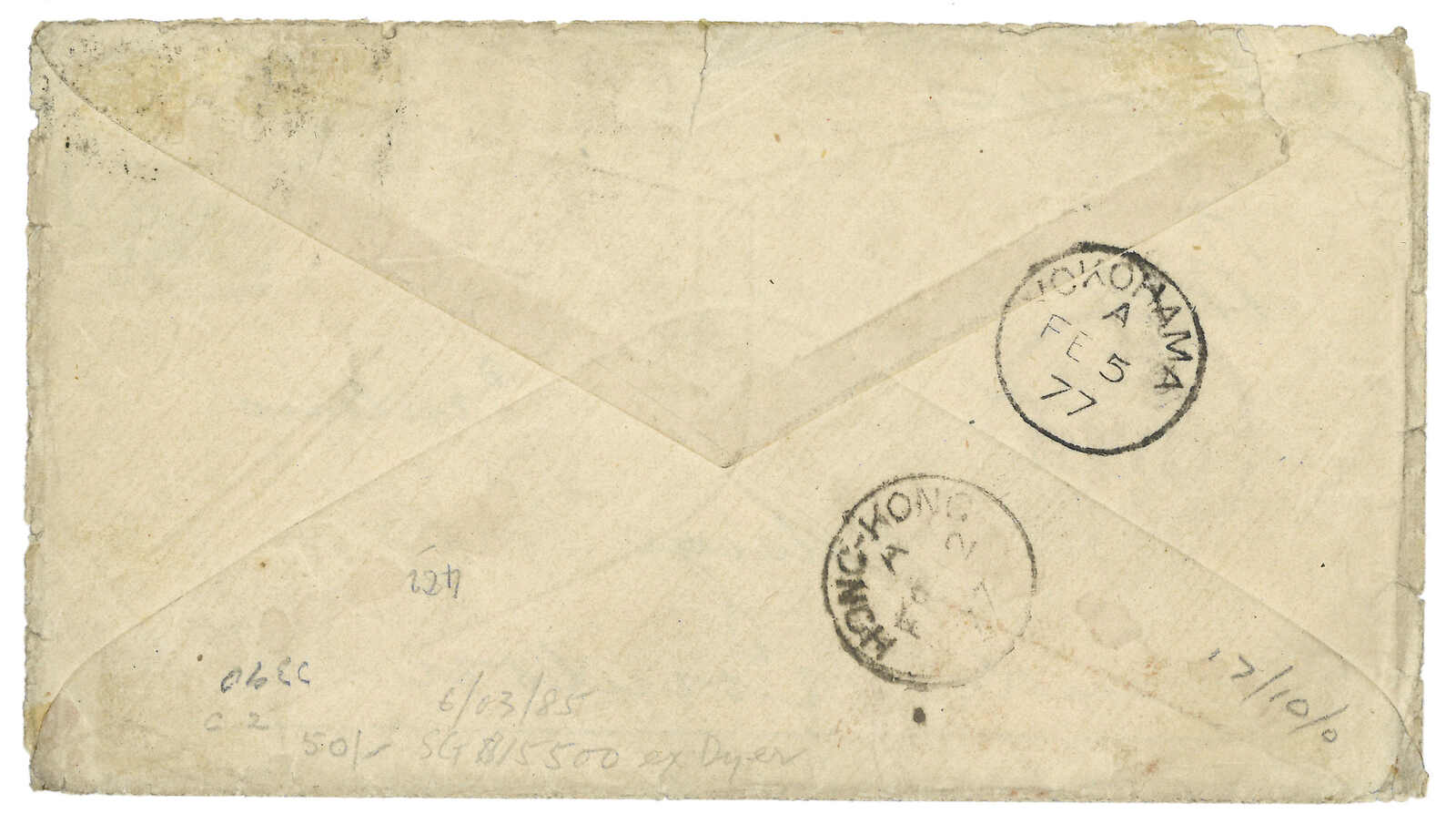 2548 cover image1877 Yokohama (12 Nov) to England via Brindisi, f.w. Hong Kong QV 1st surch 16c/18c (Yang 20), tied by Y1 obliterator in black, alongside with Yokohama BPO cds. Realized HKD$90,000. Scarce franking as Webb only recorded one cover f.w. this stamp from Yokohama.