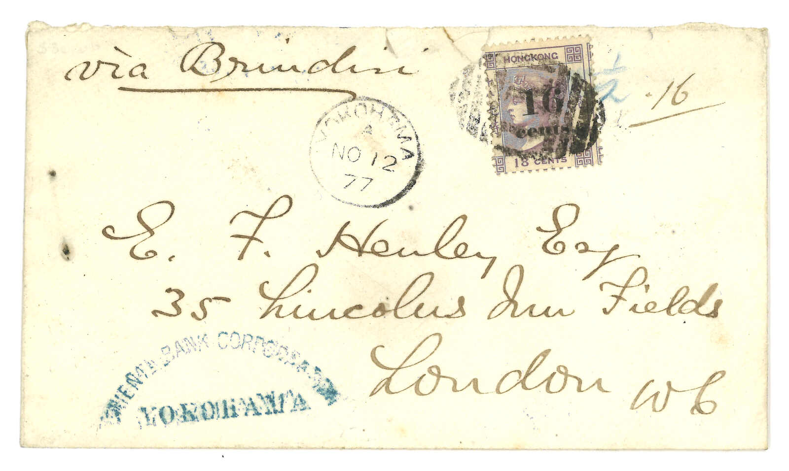 1877.11.12 橫濱經布林迪西寄英國,貼香港維多利亞女皇像第一次改值16仙蓋18仙(楊目20),銷Y1黑色殺手戳,旁蓋有橫濱英局日戳。曾以港幣90,000元拍出。Webb記錄中,貼有此票並從橫濱寄出者僅有一件。(Image 1) (Image 2)