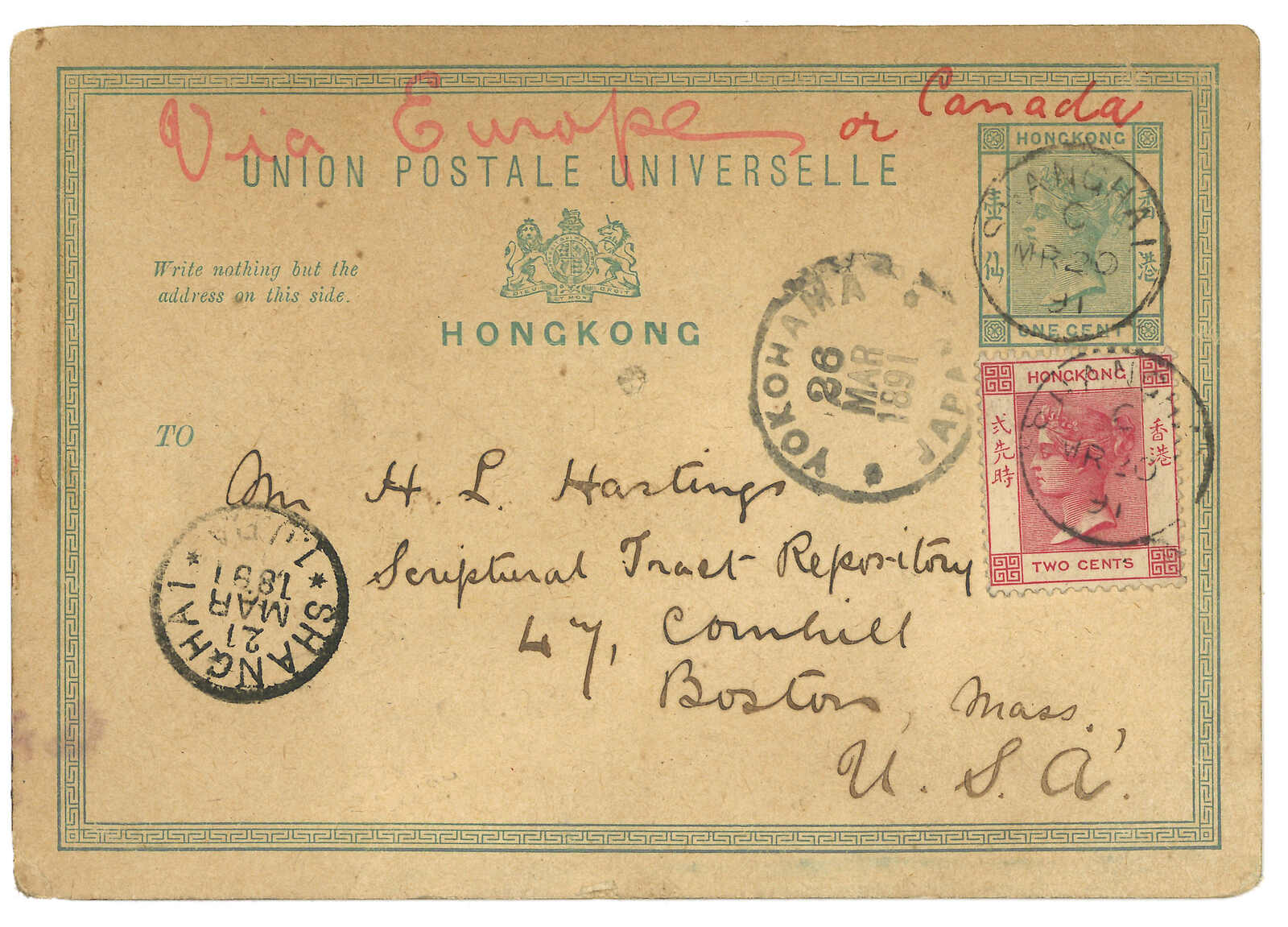 3033 cover image1891 Shanghai (20 Mar) to USA. Hong Kong QV 1c PSC, uprated by 2c, tied by Shanghai BPO cds. Showing "Via Europe ou Canada" annotation. Transit IJPA Shanghai (21 Mar), Yokohama (26 Mar).