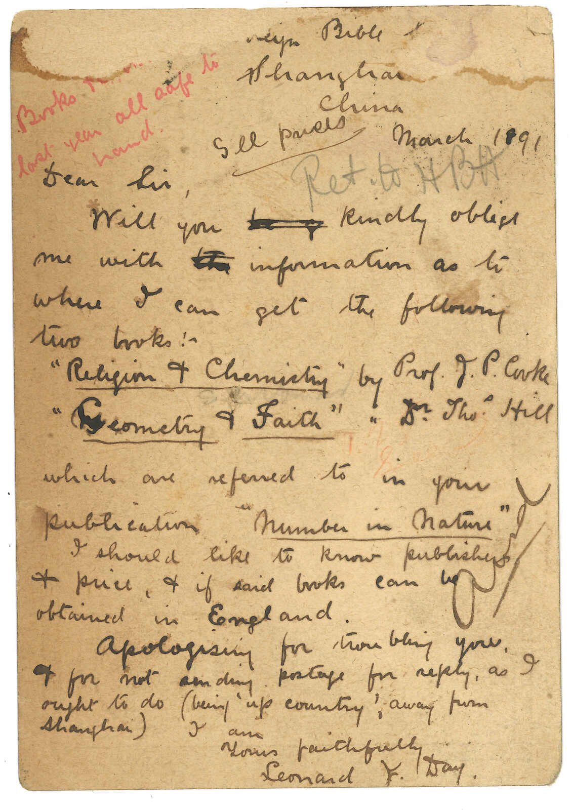 1891.3.20 上海寄美國。香港維多利亞女皇像1仙郵資片,加貼2仙,銷上海英局日戳。寫有“Via Europe ou Canada”批示。3.21經上海日局,3.26經橫濱。(Image 1) (Image 2)
