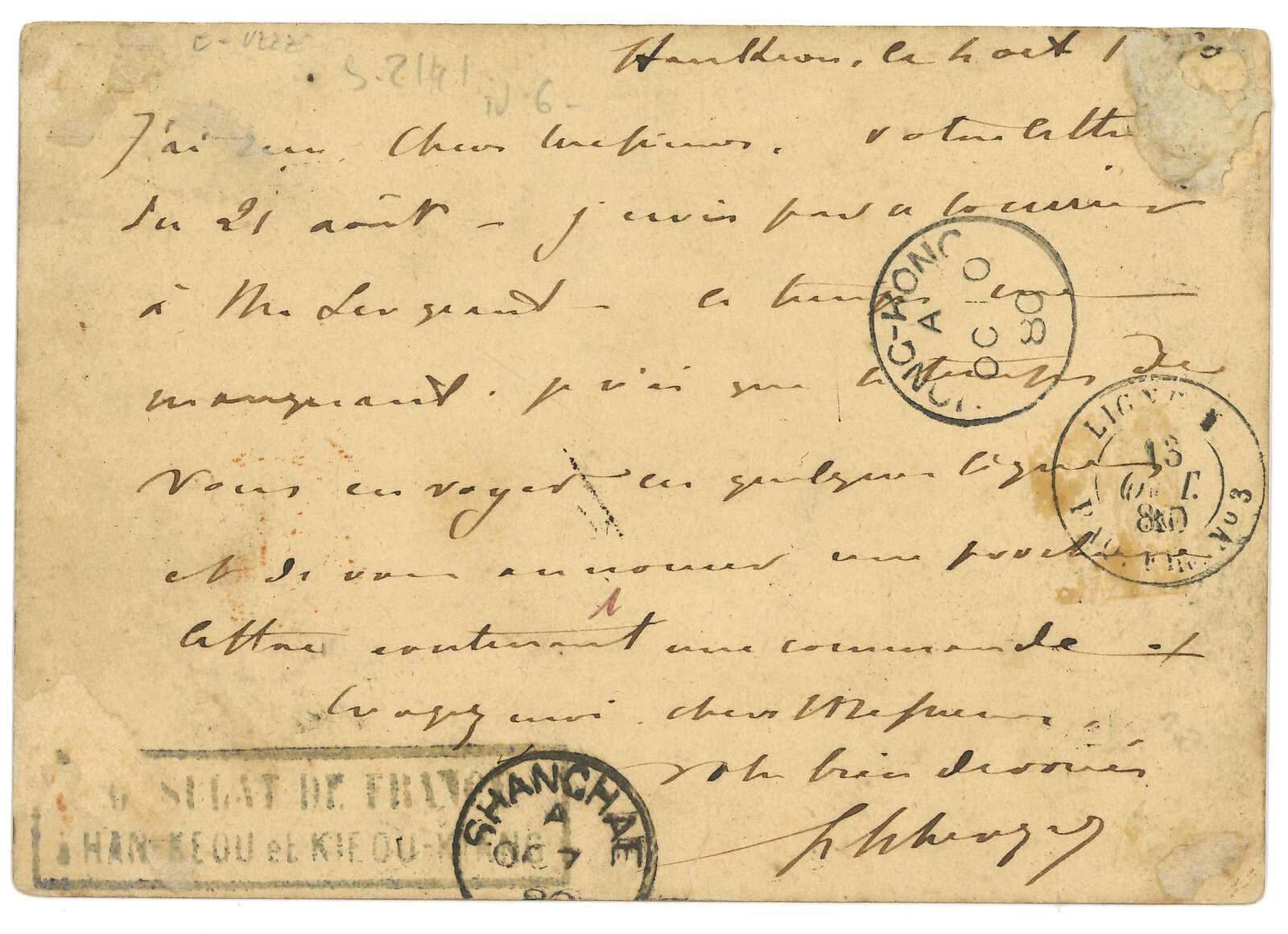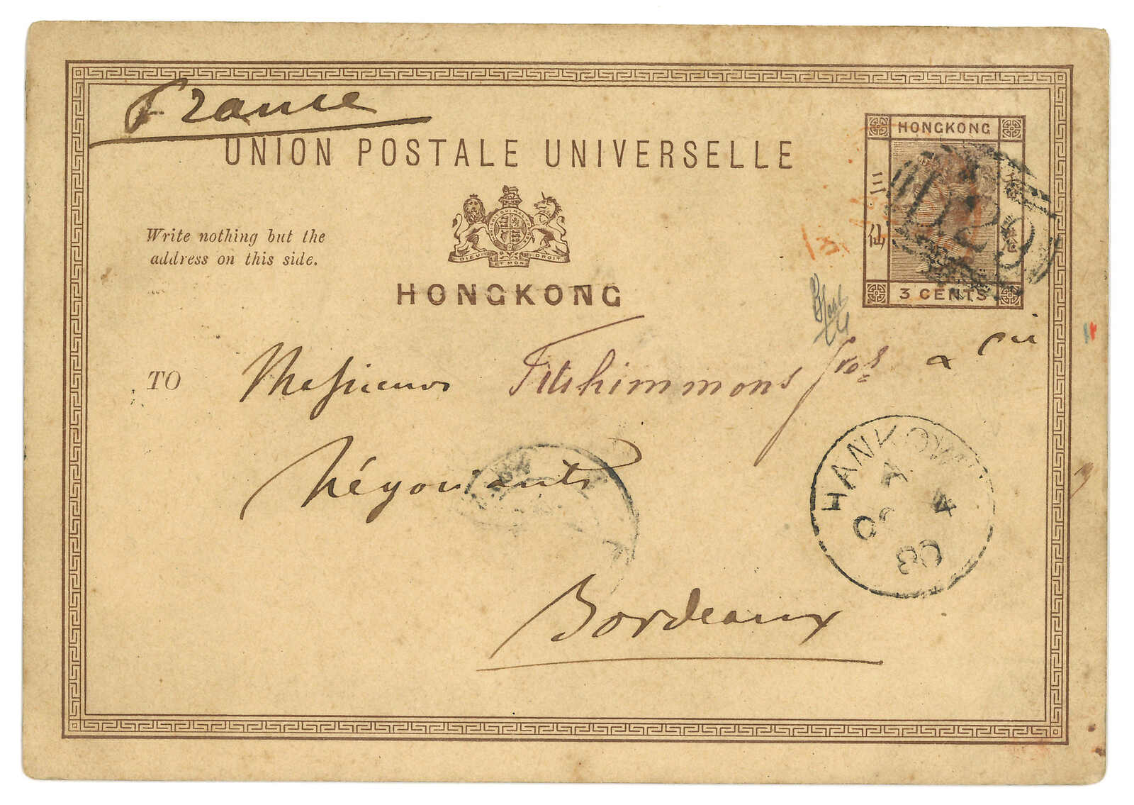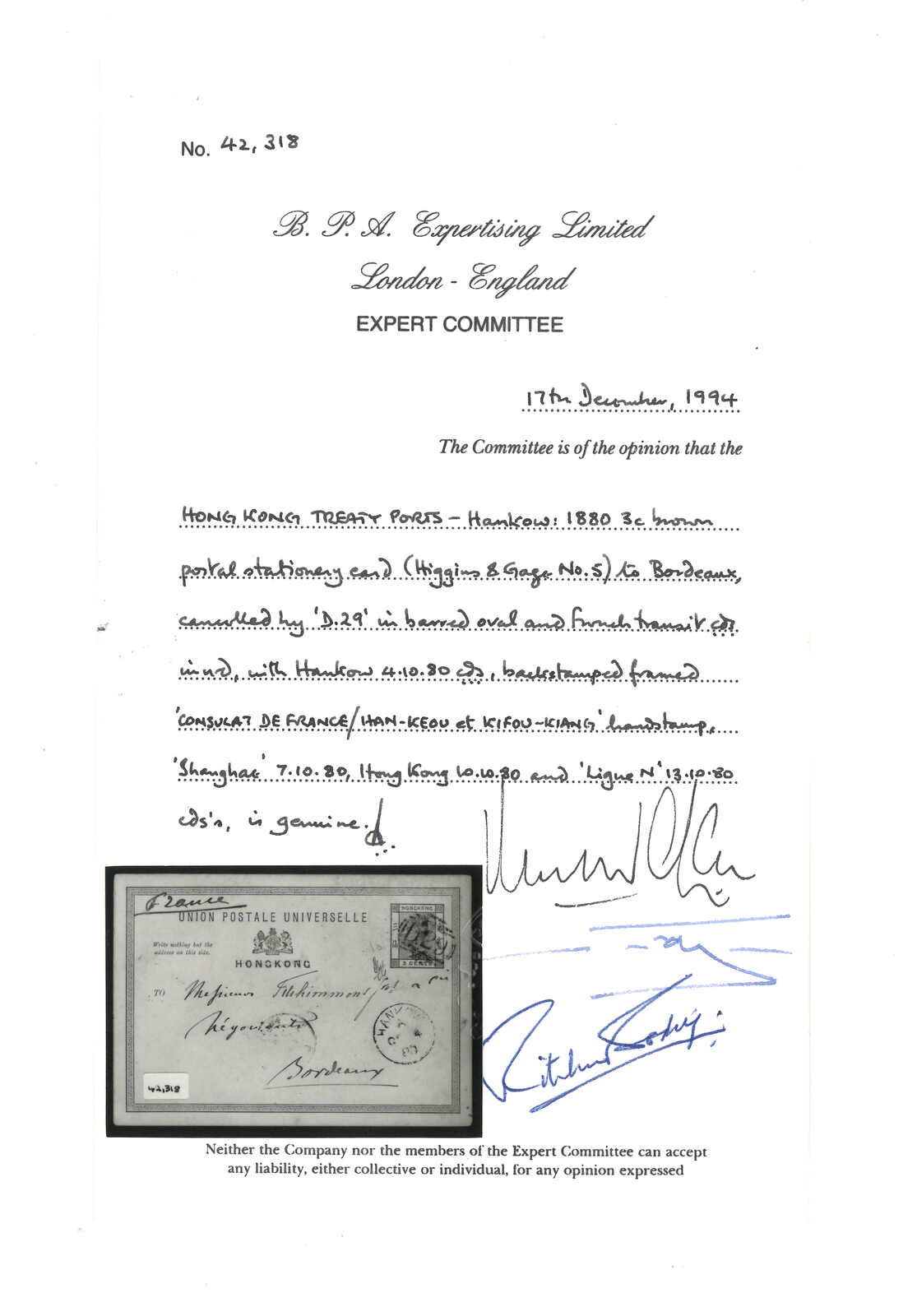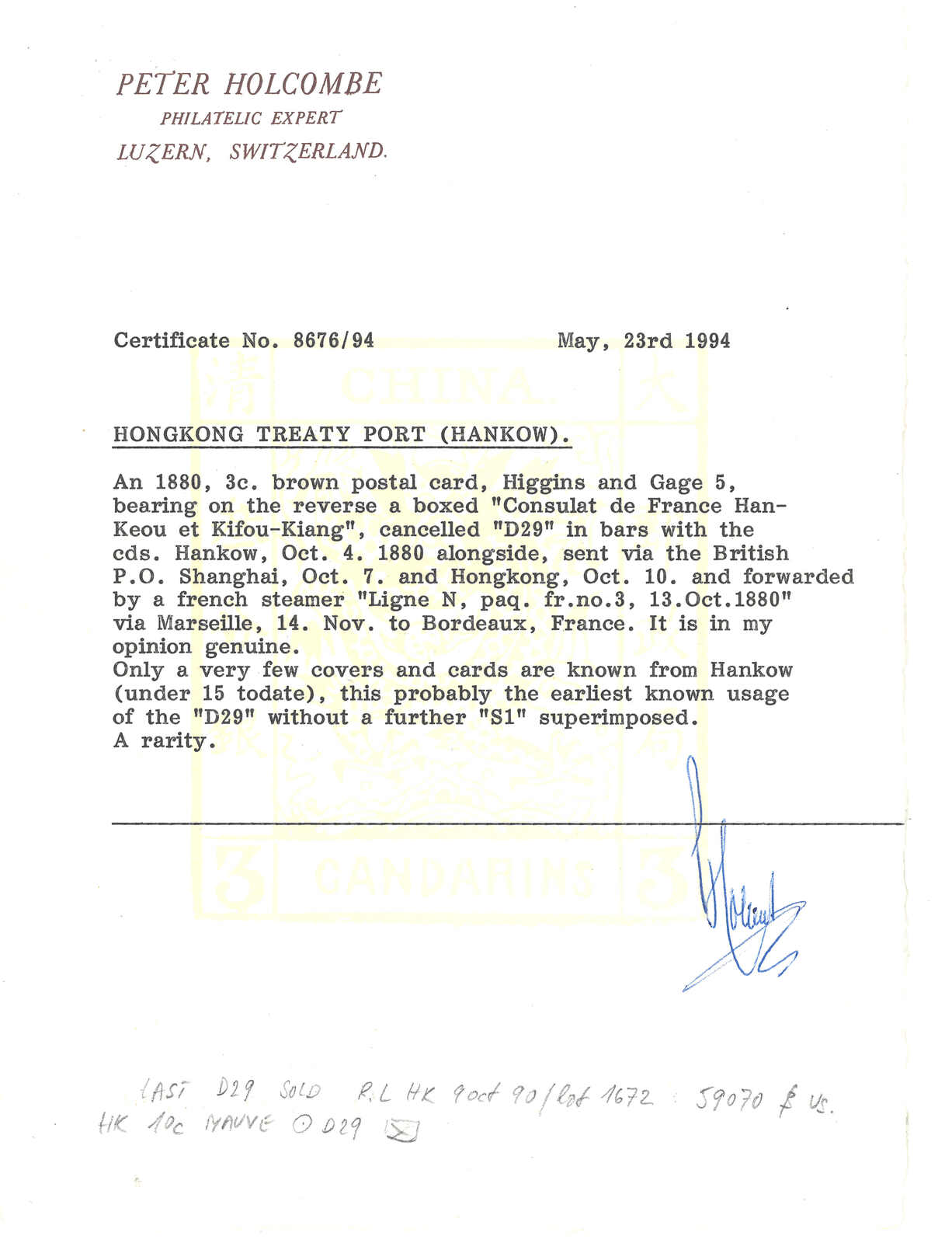 1880.10.4 漢口寄法國。香港維多利亞女皇像3仙郵資片,銷極為稀罕難得之D29殺手戳,旁蓋漢口英局日戳。10.7經上海英局,10.10經香港,10.13經法國郵船N線。此戳本已稀罕難得,更應為不帶S1殺手戳之最早例子。附BPA證書、Holcombe簽署及證書。為《Hankow D29 covers and postcards listing (July 2007)》一文記錄的15件D29封片中的第九件。2005.3.10 斯賓克倫敦,拍品號837,落鎚價7000英鎊。(Image 1) (Image 2) (Image 3) (Image 4)