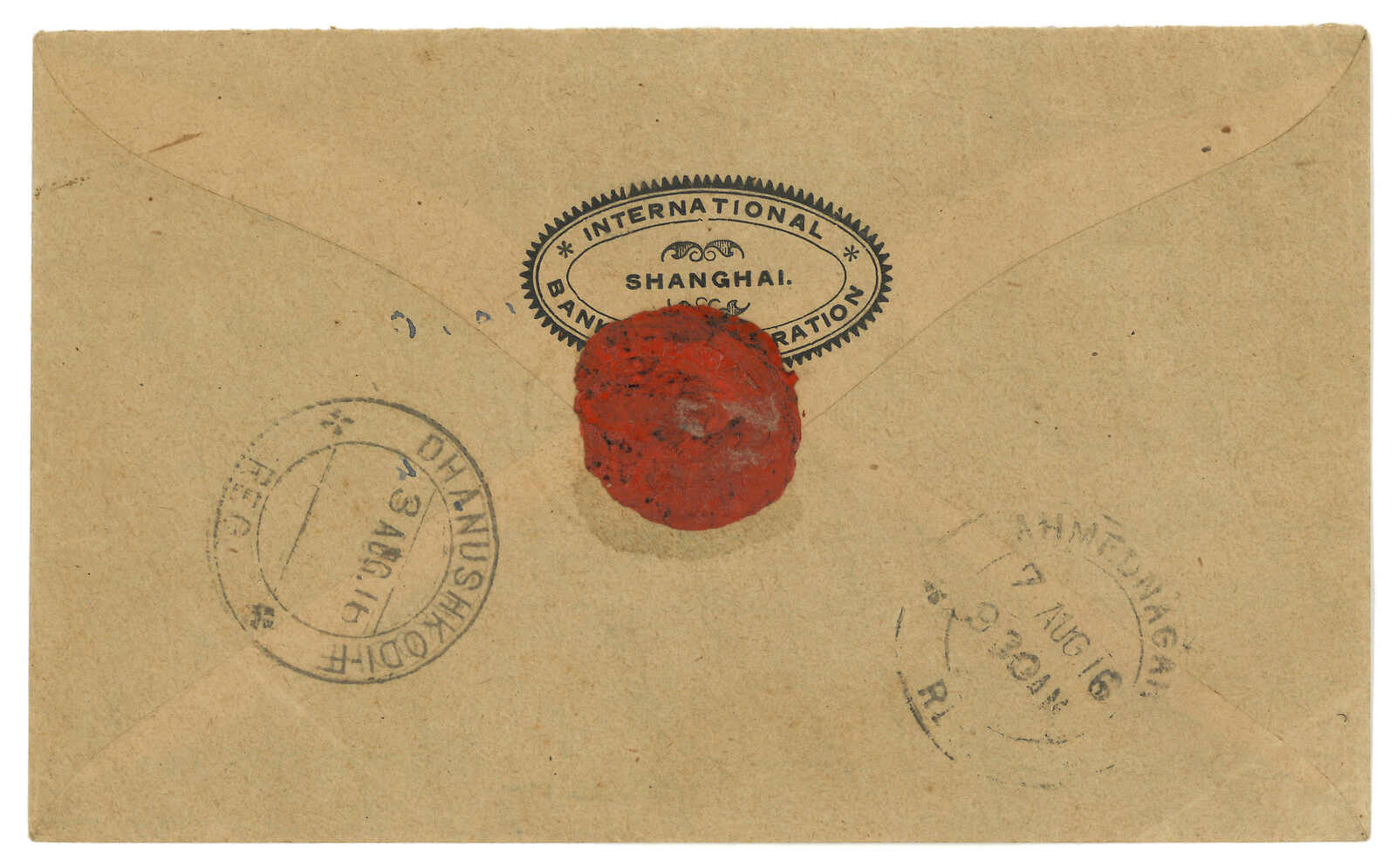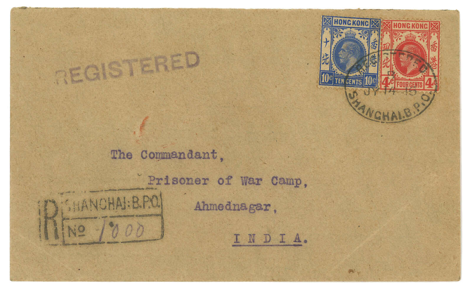 1916.7.14 上海寄印度Ahmednagar戰俘營,貼香港佐治五世4仙 + 10仙,銷上海英局橢圓形日戳,旁鈐掛號標籤。8.3經Dhanushkodi。8.7抵Ahmednagar。自中國寄印度戰俘營之一戰郵件較少見。(Image 1) (Image 2)