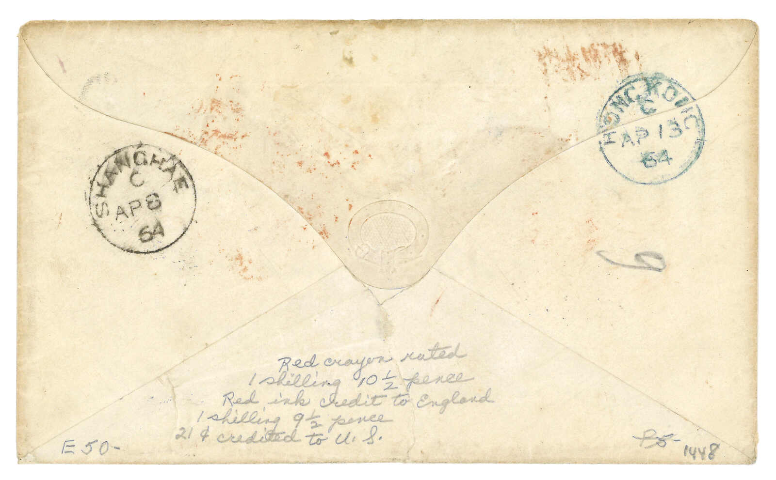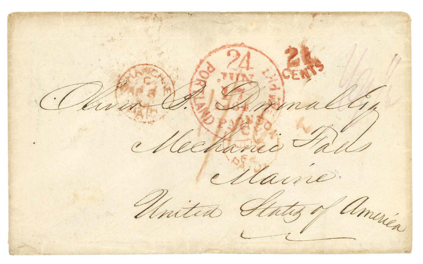 3031 cover image1864 (Apr 8), Shanghai, China, to Mechanic Falls Me., 1864. Cover to Oliver B. Dwinal, Mechanic Falls Me., red "Shanghae Paid C AP 8 64" circular datestamp, "Shanghae C AP 8 64" and blue "Hong Kong C AP 13 64" backstamps, red "1/9 ½" and "1/10 ½" rates, red London Paid datestamp (Jun. 2) and "21 Cents" credit handstamp, full clear strike of "Portland Me. Am. Pkt. 24 Paid Jun. 17 1864" 24c integral-rate datestamp applied at the Portland exchange office. Unlike the ports of Chicago, Boston or New York, it is very scarce to land and exchange through the Portland P.O., and particularly so for the China mails.(Image 1) (Image 2)