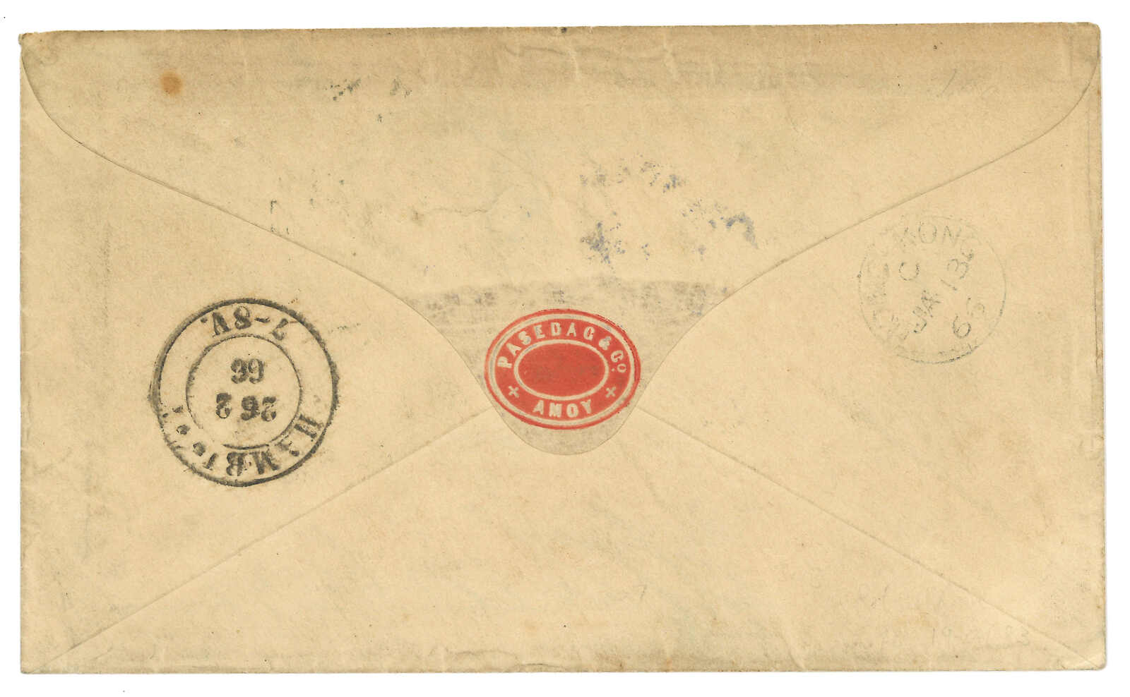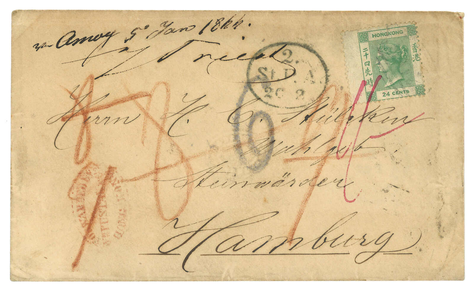 3032 cover image1866 (Jan 5), envelope embossed “PASEDAG & Co./AMOY” seal on flap to Steinwarder Hamburg / p. Triest, showing oval “FORWARDED BY / Wm. PUSTAU & Co. / HONG KONG” handstamp in red and bearing Hong Kong 24c green wing margin (tear at top) cancelled “B62”, with matching “HONG-KONG / C” c.d.s. (18 Jan) on reverse, black oval “2. / St. P.A. / 2C 2” handstamp on front, rate “1/-”, handstruck “6” applied at Triest, “8” Schillinge plus local delivery equals Hamburg “9” Schillinge. Very fine and early franked cover from the Treaty Port of Amoy. According to the research from Dr. Jeff. Schneider at the time, this cover was the earliest recorded HK QV stamped cover from Amoy to Germany. Provenance: Richard C.K. Chan(Image 1) (Image 2)