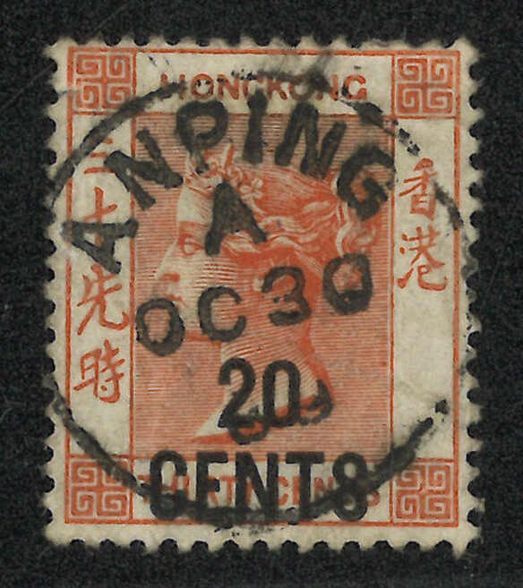 3045 o image1889 (30 Oct) Hong Kong QV 3rd surch 20c/30c orange red (Yang 37), tied by scarce Anping BPO Webb type A cds. Webb recorded only about 36 stamps applied with this cancellation.. Usage on high denomination 20c is also rare.