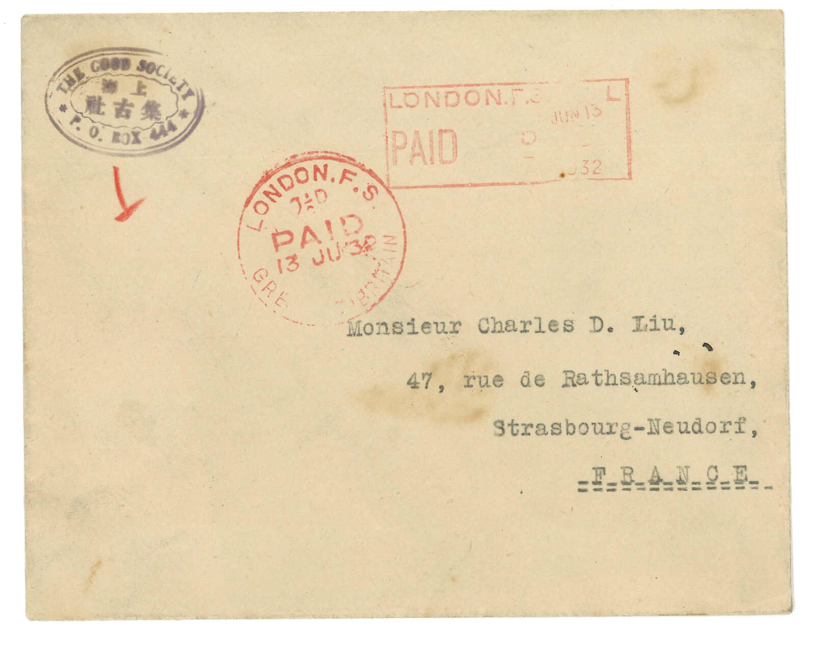 3038 cover image1932 Shanghai to France, f.w. Emergency Postal Service Shanghai 1oz letter coupon on reverse with EPS seal. Arrived London (13 Jun). Exceptional example during the strike of Shanghai PO workers.