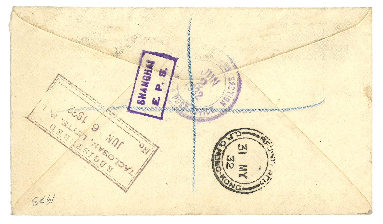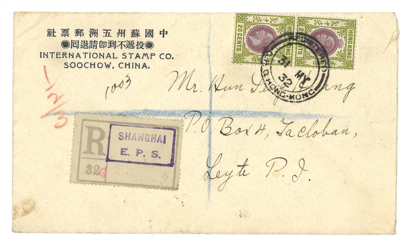 1932年上海寄香港,正貼緊急郵政服務掛號標籤,背鈐“SHANGHAI EPS”戳記。加貼香港佐治五世20仙雙連,銷5.31香港總局掛號日戳。出自1932年郵政工人罷工時期的出色例子。(Image 1) (Image 2)