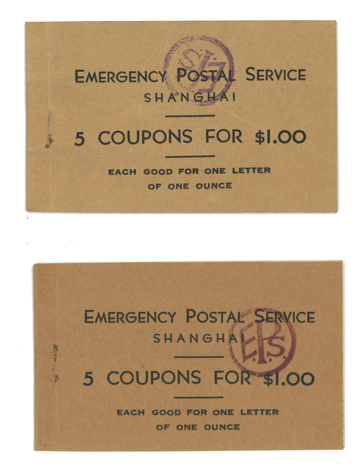 3036 image1932 Empergency Postal Service Shanghai coupon booklet x2, applied with "EPS" ciruclar seal in carmine and violet respectively. Each with 5 coupons inside. A nice pair.