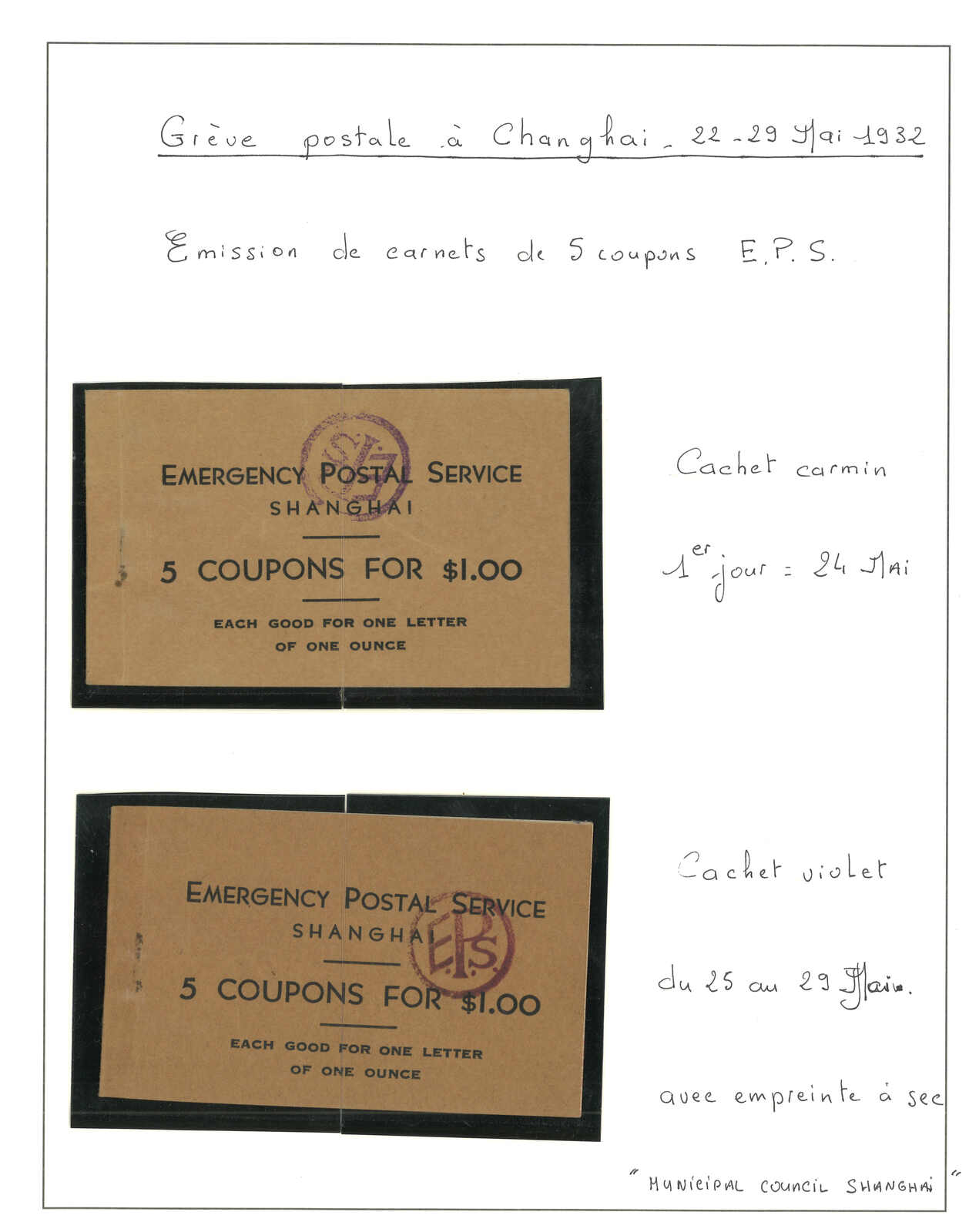 1932年上海信件緊急代郵券小本票兩件,分別鈐紅色及紫色“EPS”圓戳。均內含五張代郵券。出色。(Image 1) (Image 2) (Image 3)