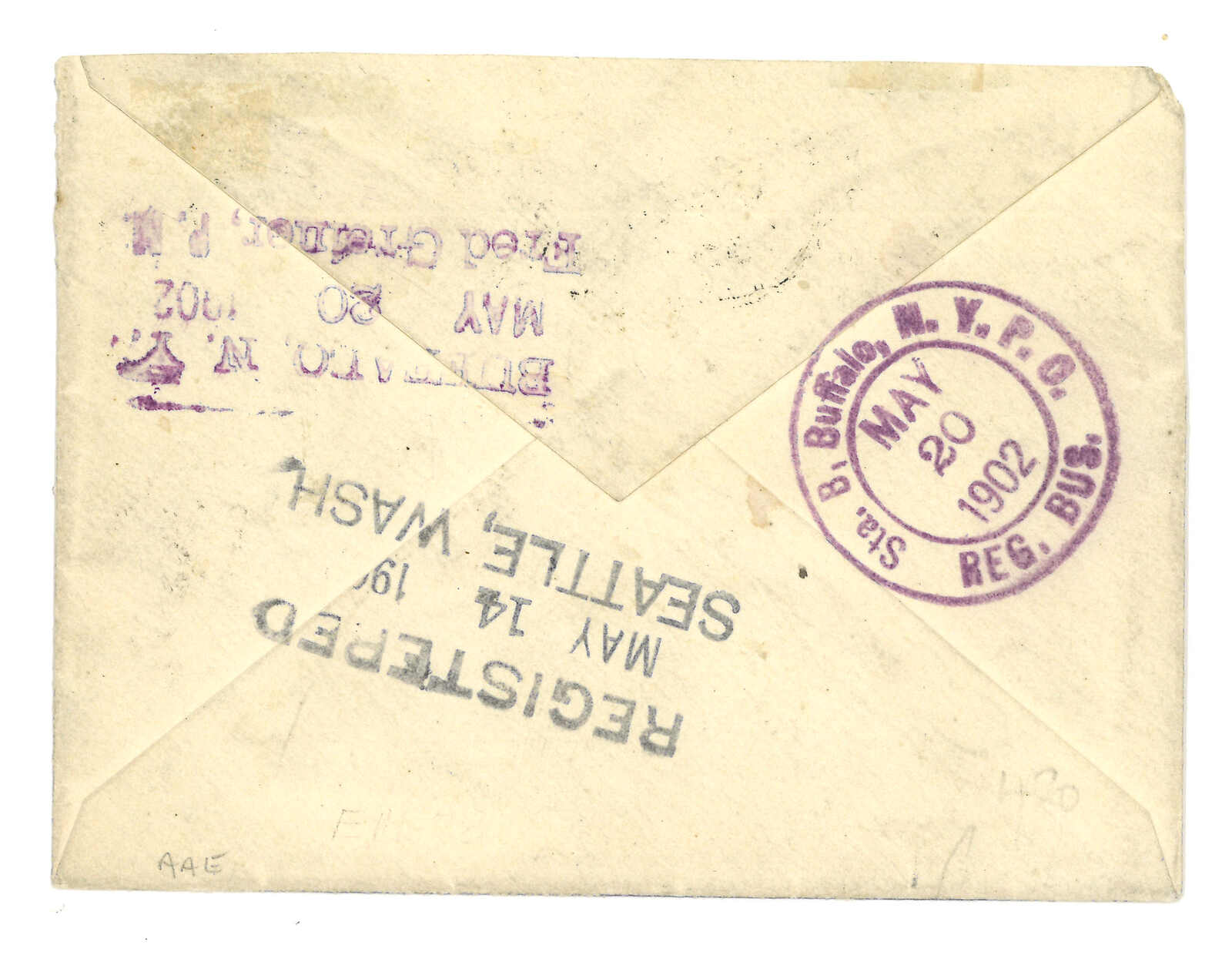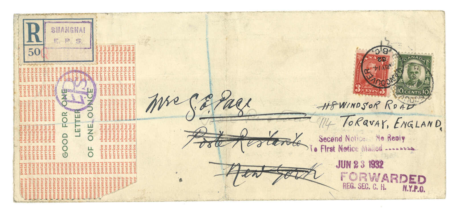 1932年上海經加拿大寄美國,改寄英國,貼1盎司信件緊急代郵券及“SHANGHAI EPS”掛號標籤。6.14經溫哥華,加貼加拿大票3分 + 10分。6.20抵紐約,改寄英國,7.22抵Torquay。有趣之改寄例子。(Image 1) (Image 2)