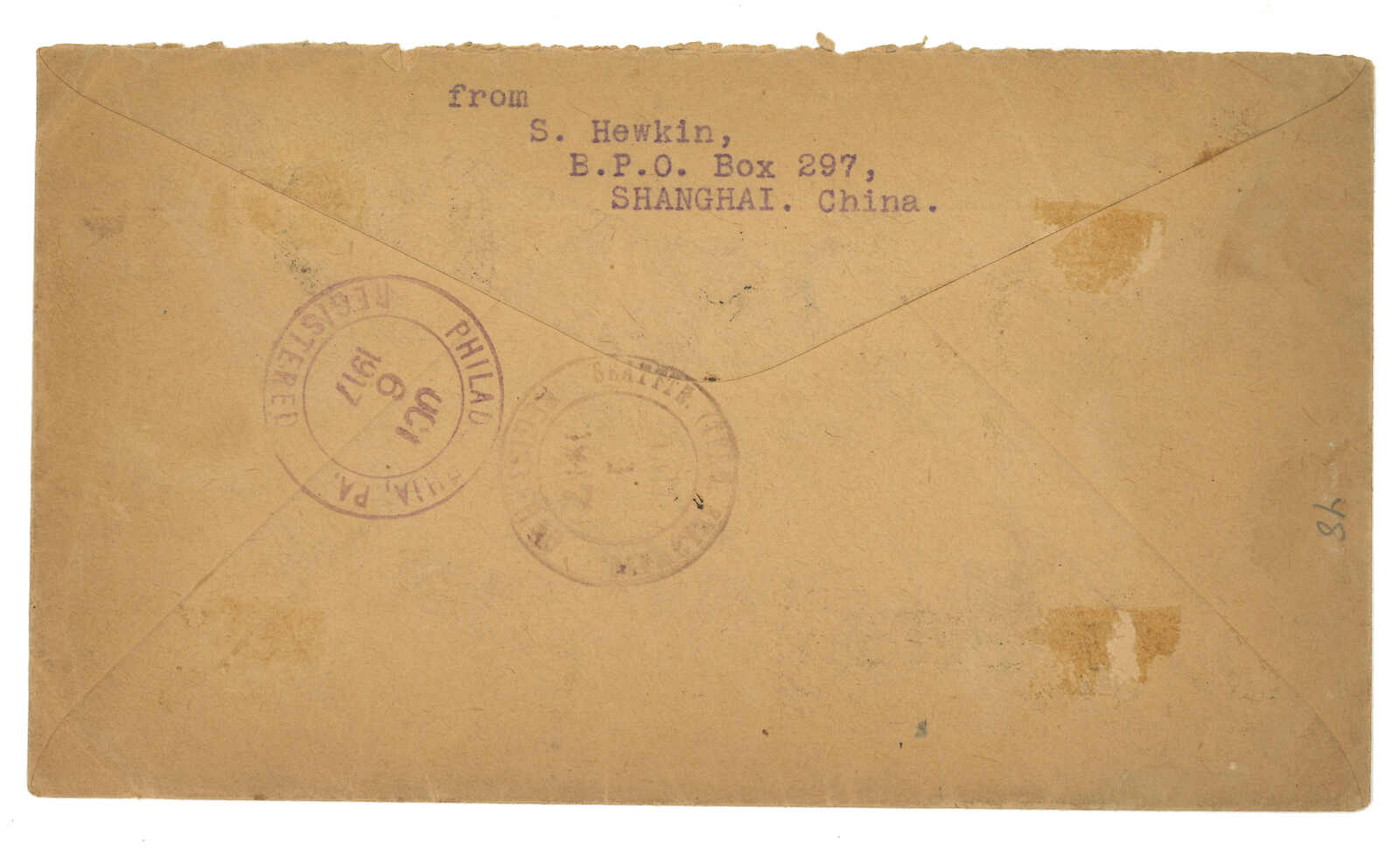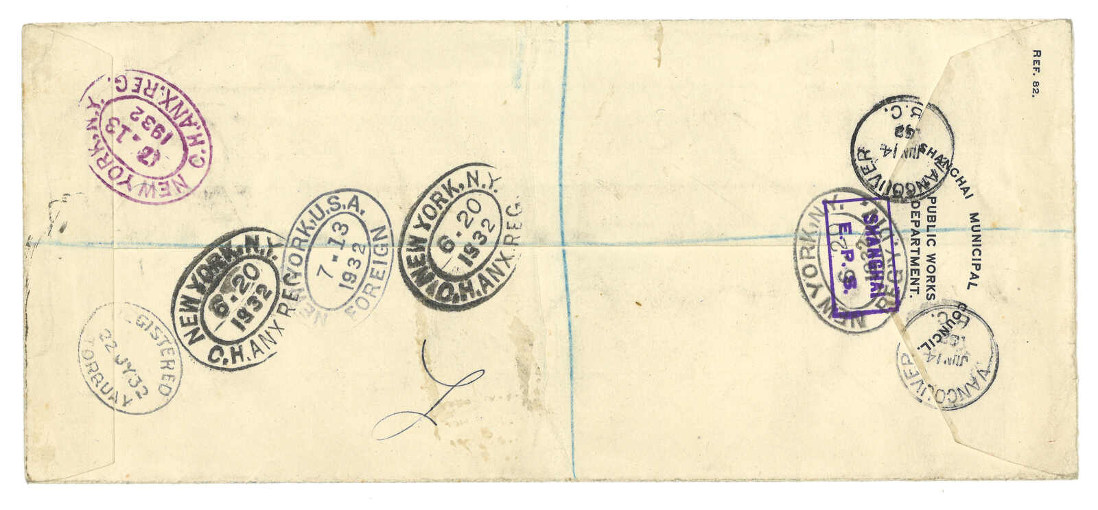 3039 cover image1932 Shanghai to USA via Canada, redirected to England, f.w. Emergency Postal Service Shanghai 1oz letter coupon and "SHANGHAI EPS" registered label. In combination with Canadian issue 3c + 10c, tied by Vancouver transit cds (14 Jun). Arrived New York (20 Jun) and redirected to Torquay, England (22 Jul). Interesting redirected example.