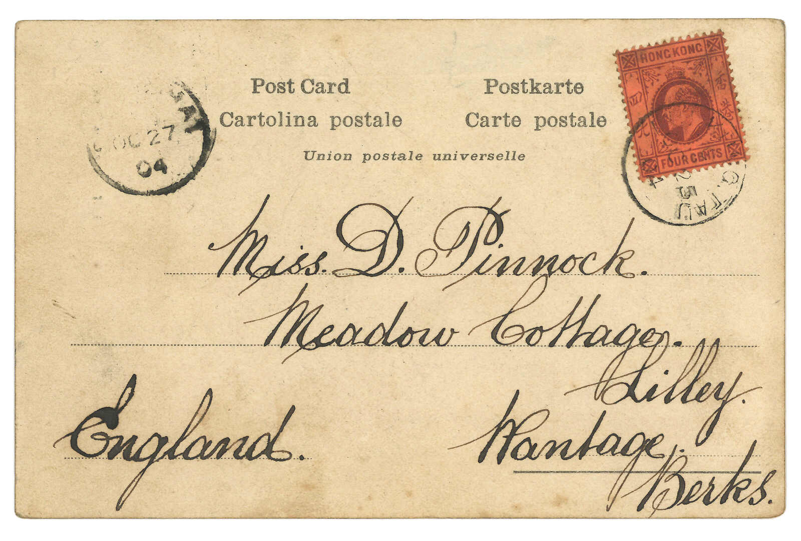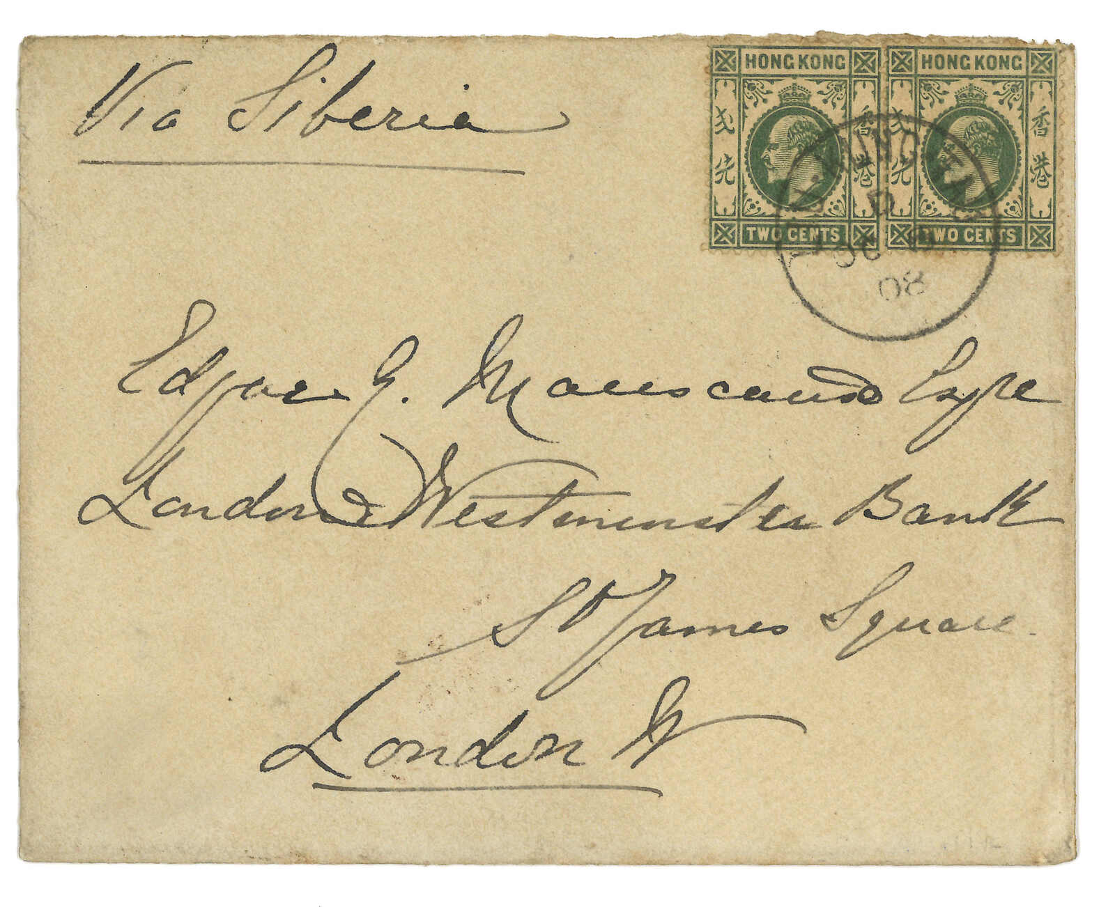 3040 cover image1904 and 1908 a pair of outgoing cover and postcard from Liu Kung Tau BPO, f.w. Hong Kong KEVII 4c and 2c in pair, tied by Webb type B and C cds respectively.