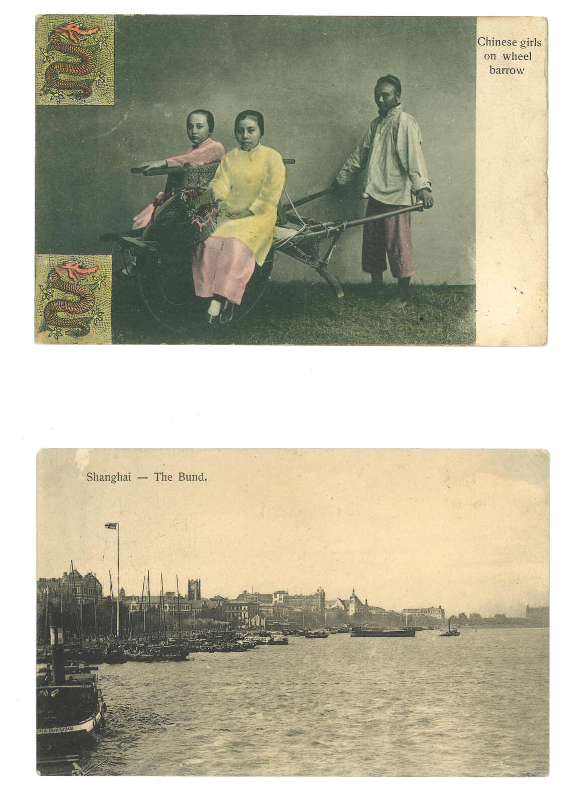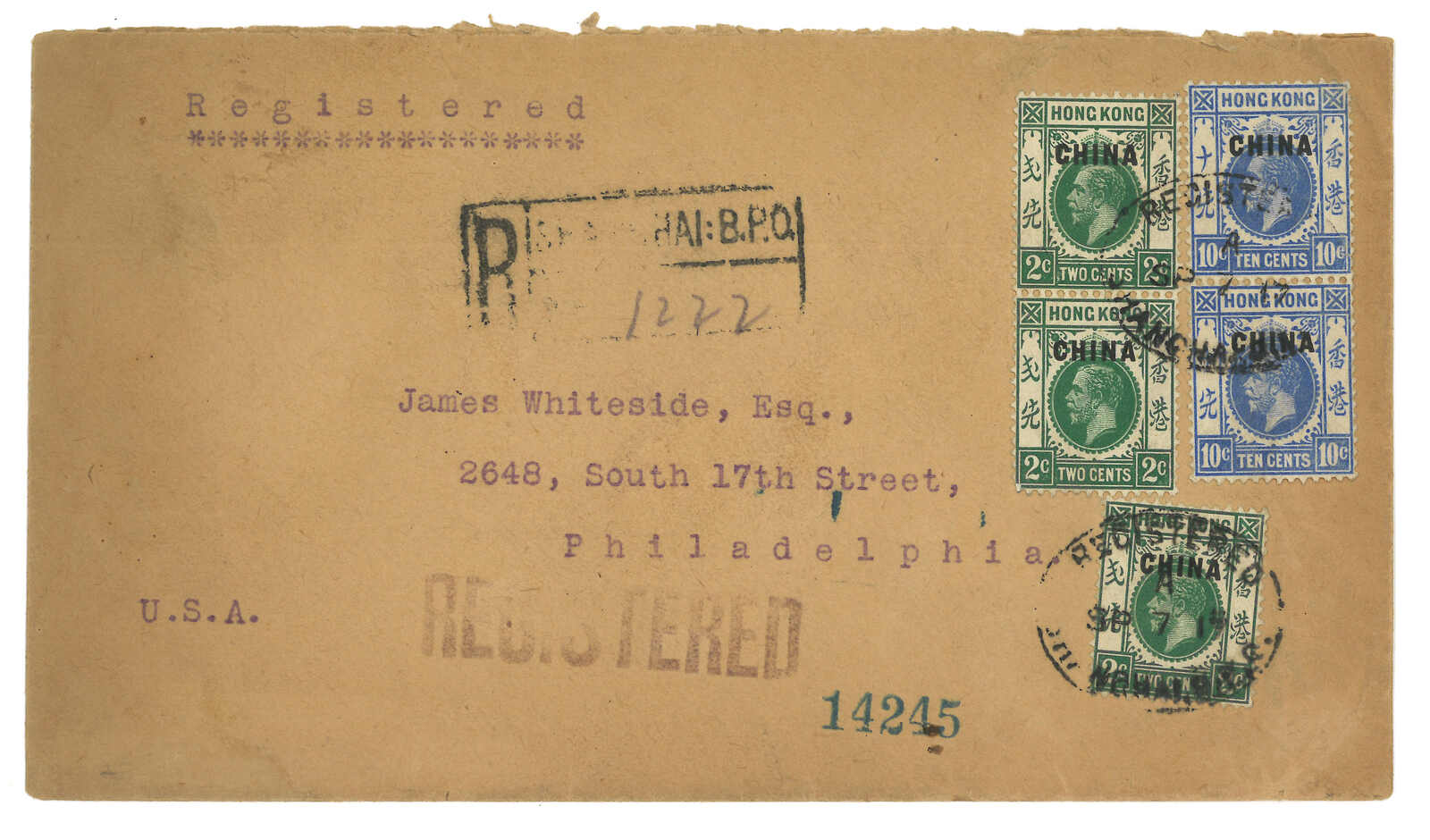 3035 cover image1900-1910s a group of 4 outgoing covers and postcards from Shanghai BPO, f.w. Hong Kong QV surch, KEVII, KGV and ovpt. CHINA issues, tied by Webb type L, type R4 andn other cds.