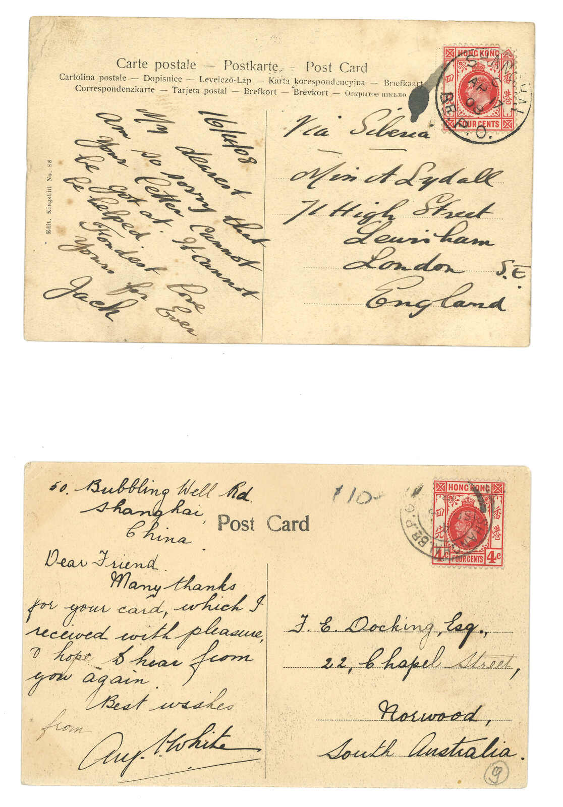 1904及1908年一對自劉公島英局寄國外封片,貼香港愛德華七世4仙及2仙雙連,銷劉公島英局B型及C型日戳。(Image 1) (Image 2) (Image 3) (Image 4)