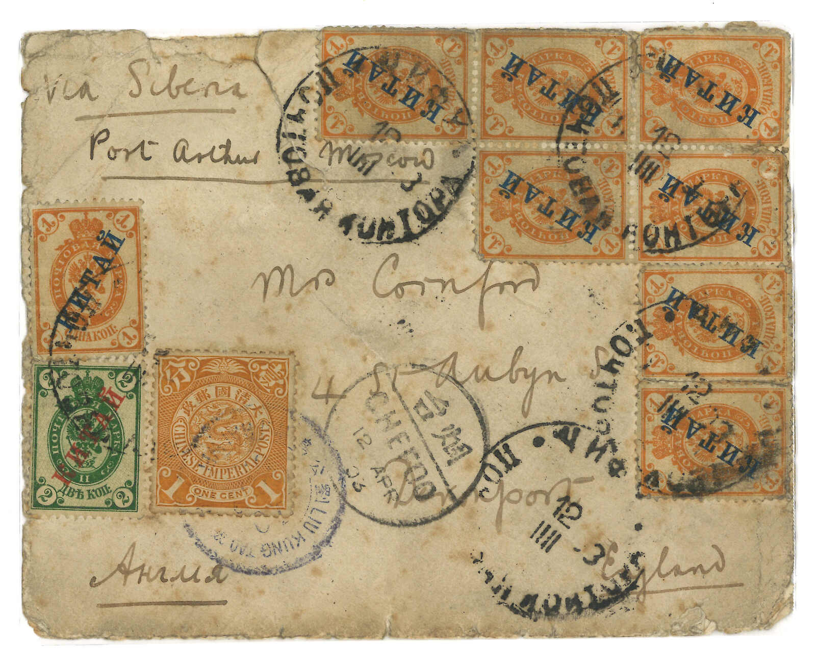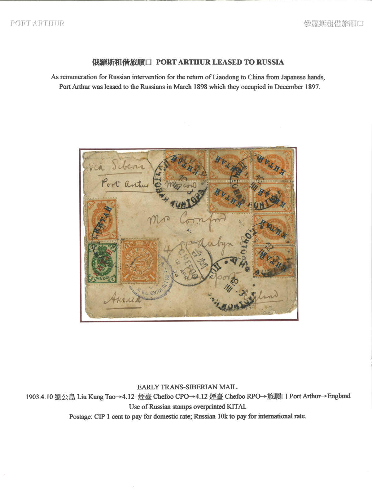 1903.4.10 劉公島寄英國,貼蟠龍1分,銷珍罕之“劉公島 / 威海衛”英漢藍色日戳。4.12經煙台清郵,同日經煙台俄國郵局,加貼軍徽圖加蓋KITAI 9枚,合10戈比。寫有經西伯利亞 / 旅順批示。邊緣磨損。(Image 1) (Image 2)