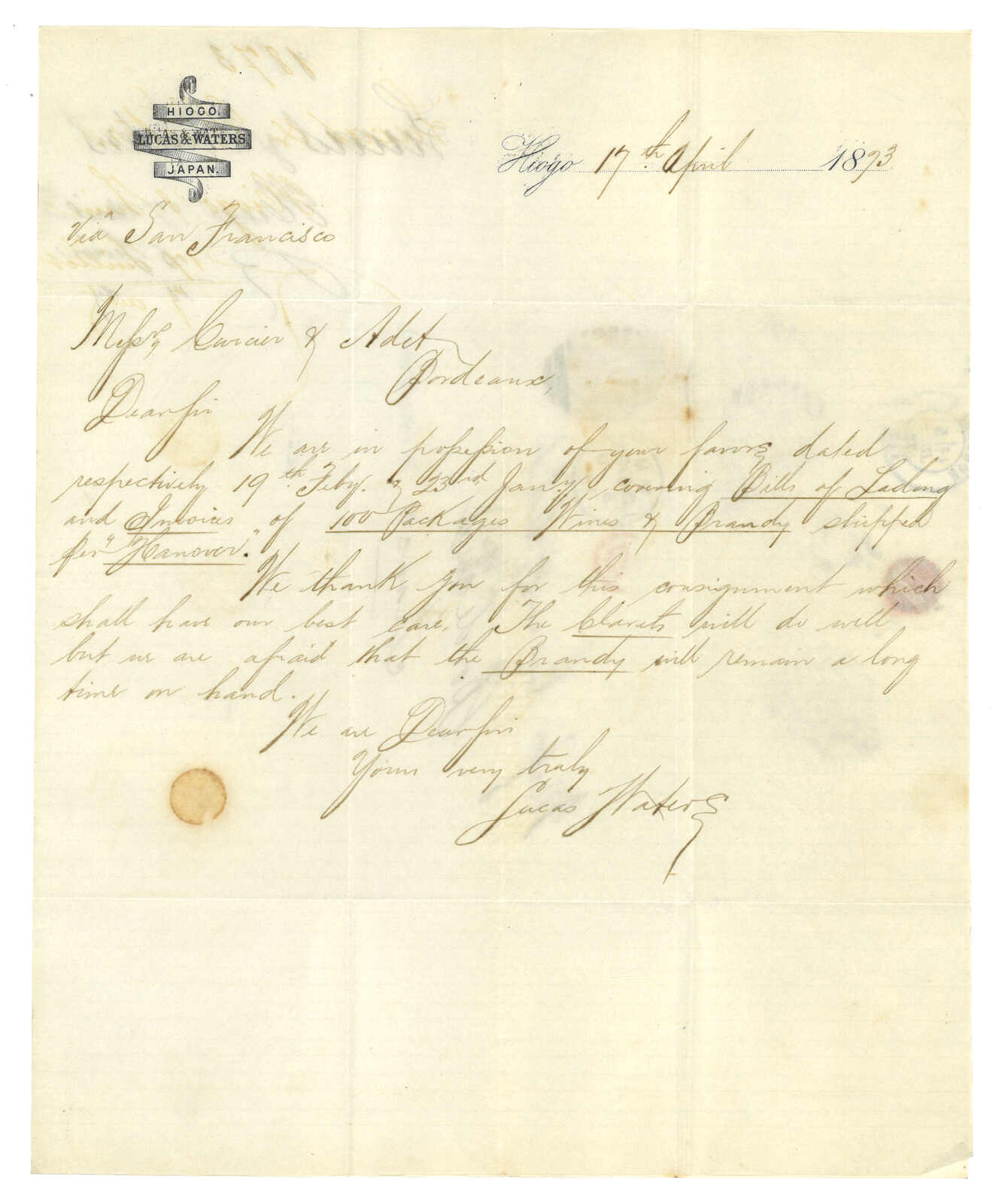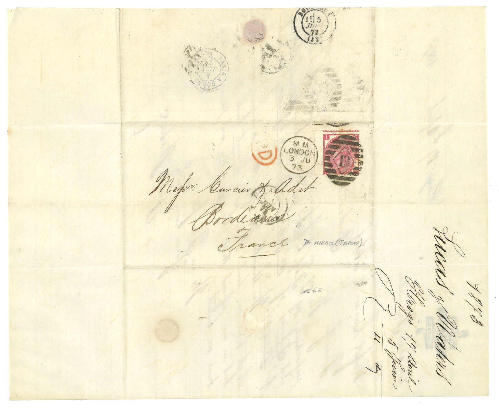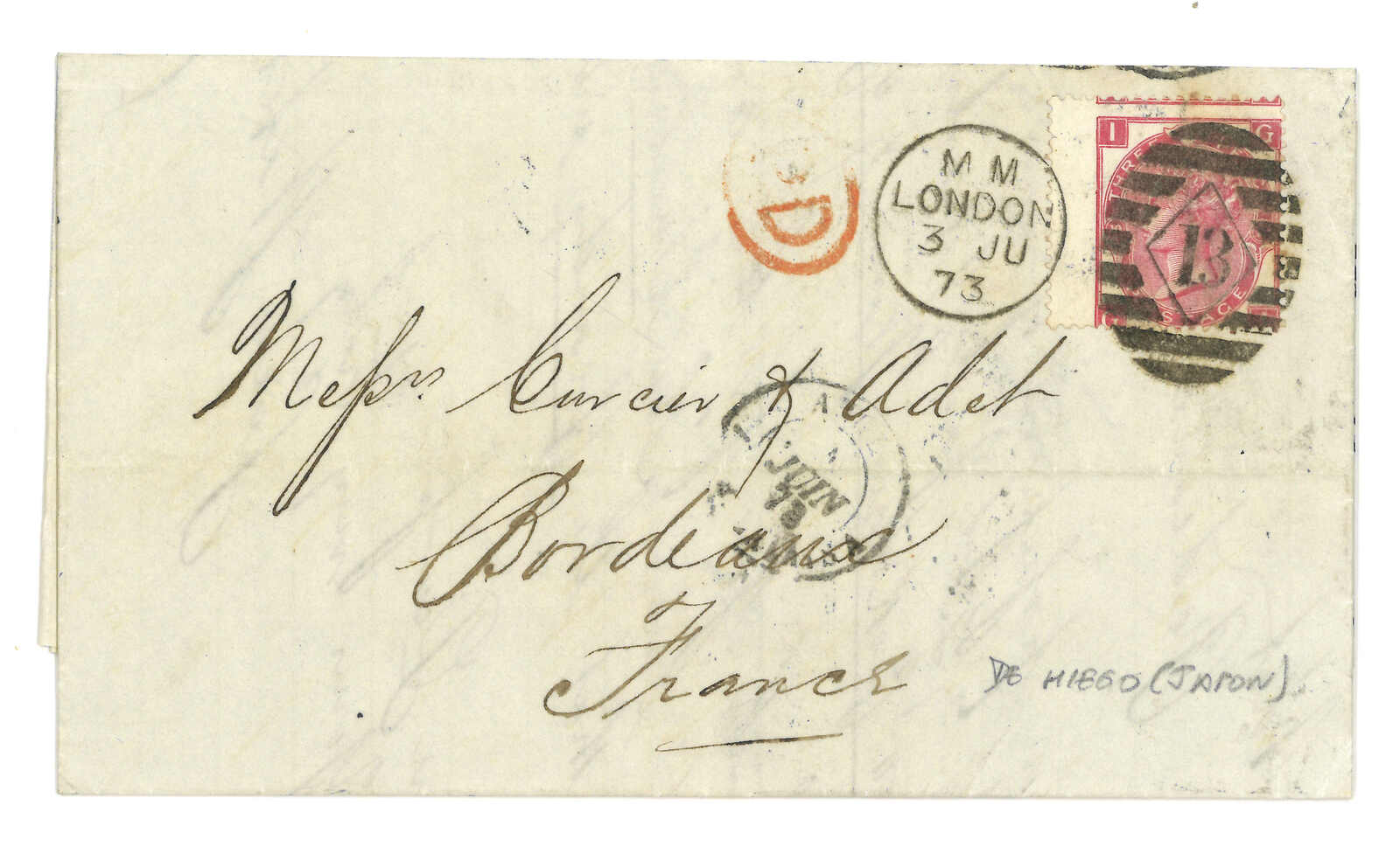 2502 cover image1873 (17 Apr) "Lucas & Waters" entire letter from Hiogo to France. Carried privately to London and f.w. QV 3d, tied by London duplex d.s (3 Jun), alongside with oval PD mark. Arrived France (Jun).