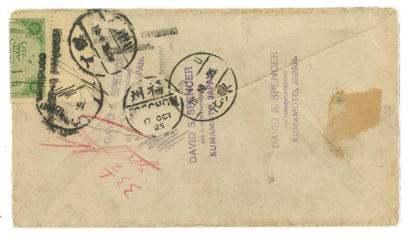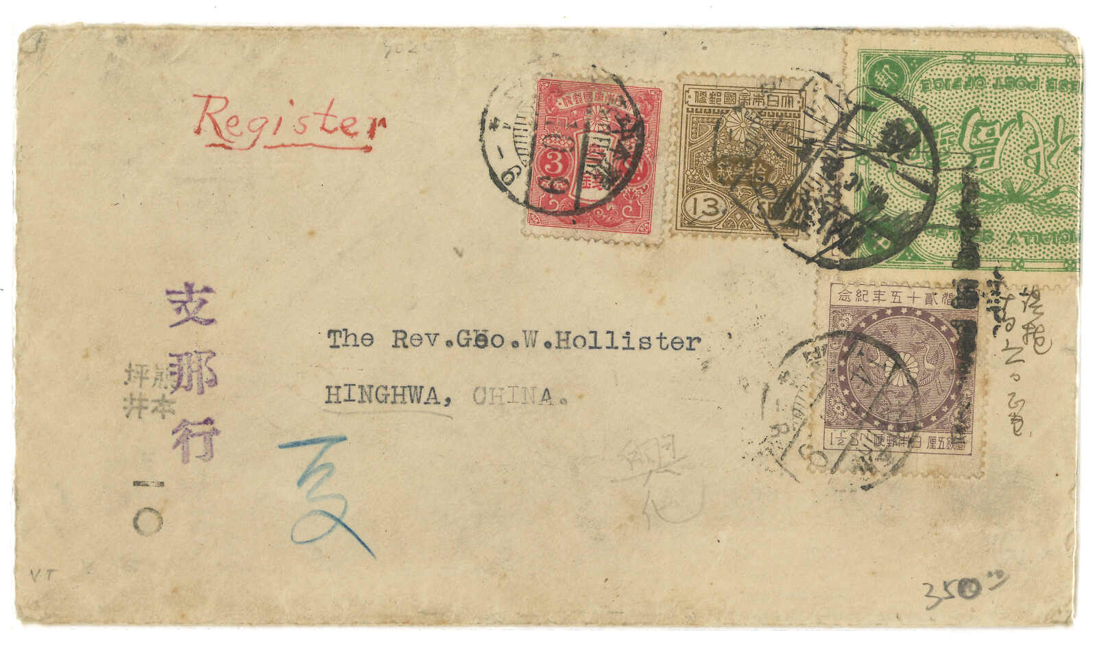 208 cover image1925 Japan (9 Oct) to Hinghwa, f.w. 3s + 13s + 1-1/2s, tied by Kumamoto cds. Applied with 2nd print officially resealed label with Shanghai (10 Oct) transit cds. Transit Foochow (17 Oct). Arrived Hinghwa (19 Oct). Illustration fig.4 in "Damaged Mails Salvaged by Reseal Labels of the Republican Post (1916-1949)" by Xiao Hong, Asian Philatelist 2011.
