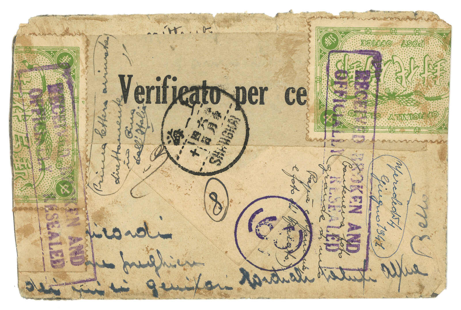 1930年代意大利寄上海,貼意大利票4枚。6.4抵上海。加貼第五版民國代封票,鈐“RECEIVED BROKEN AND OFFICIALLY RESEALED”橫戳。封面部分被裁。(Image 1) (Image 2)