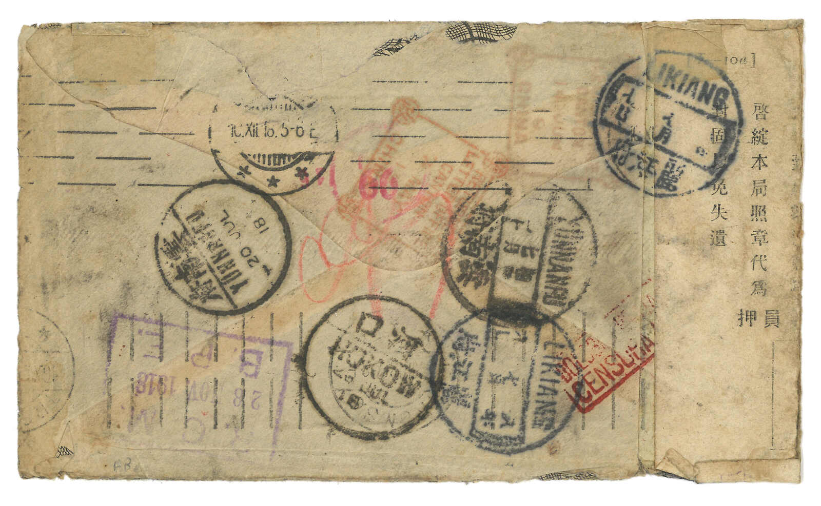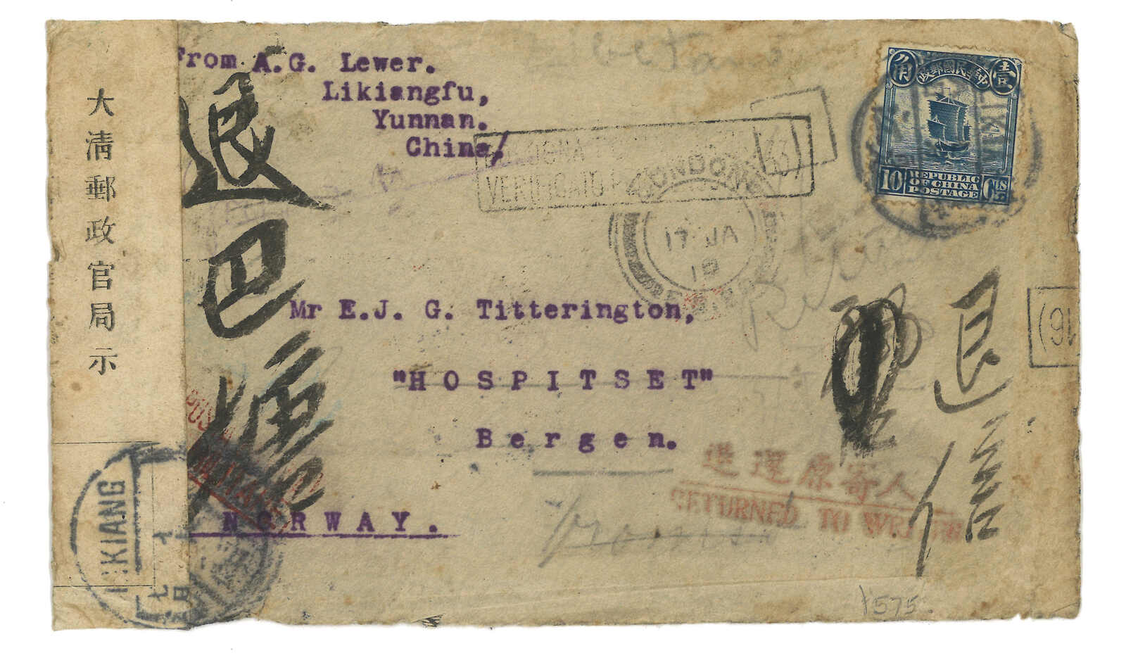 1918.7.8 麗江寄挪威,退回寄件人,貼帆船1角,銷麗江腰框英漢日戳。7.20經雲南府。於意大利檢 查。12.10抵挪威。退回寄件人,1.17經倫敦,5.7經廣州,鈐“退還原寄人”橫戳。7.6抵麗江,貼全中文“ 大清郵政官局示”重封封條。因寄件人未著,再改退巴塘。此為兩件貼用此款封條之存世信封之一。由於雲 南地位遙遠,故仍沿用清代郵政用品。(Image 1) (Image 2)