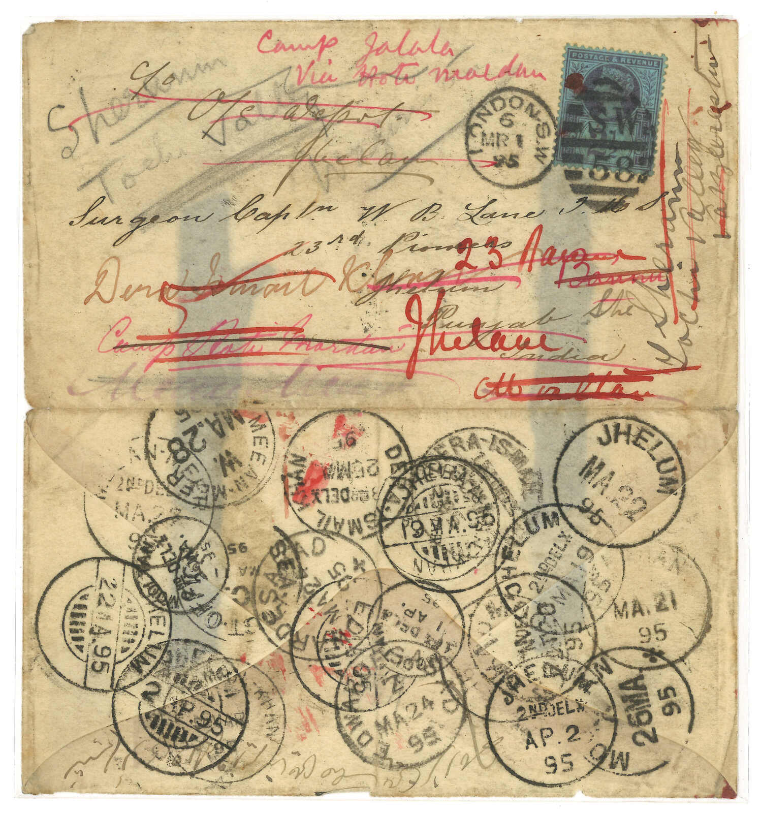 818 cover image1895 (1 Mar) Cover from England, and redirected mutliple times between Manila, Jhelum and other cities, showcasing comprehensive postmarking. Initeresting.