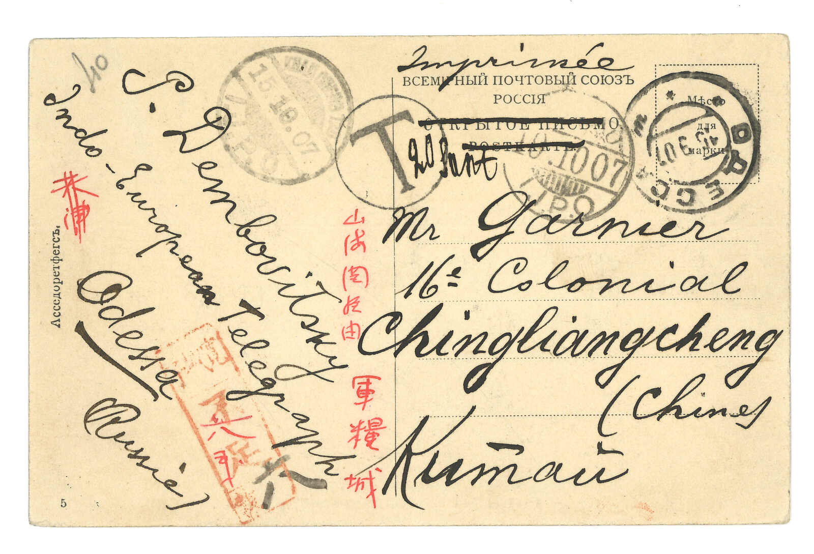 120 cover image1907 Odessa (15 Sep) to Chunliangcheng. Picture postcard, f.w. Coat of Arms 2k, tied by obliterator, matching with Odessa origin cds. Showing T mark and Kwangchentsz Japanese postage due mark. Transit IJPO.