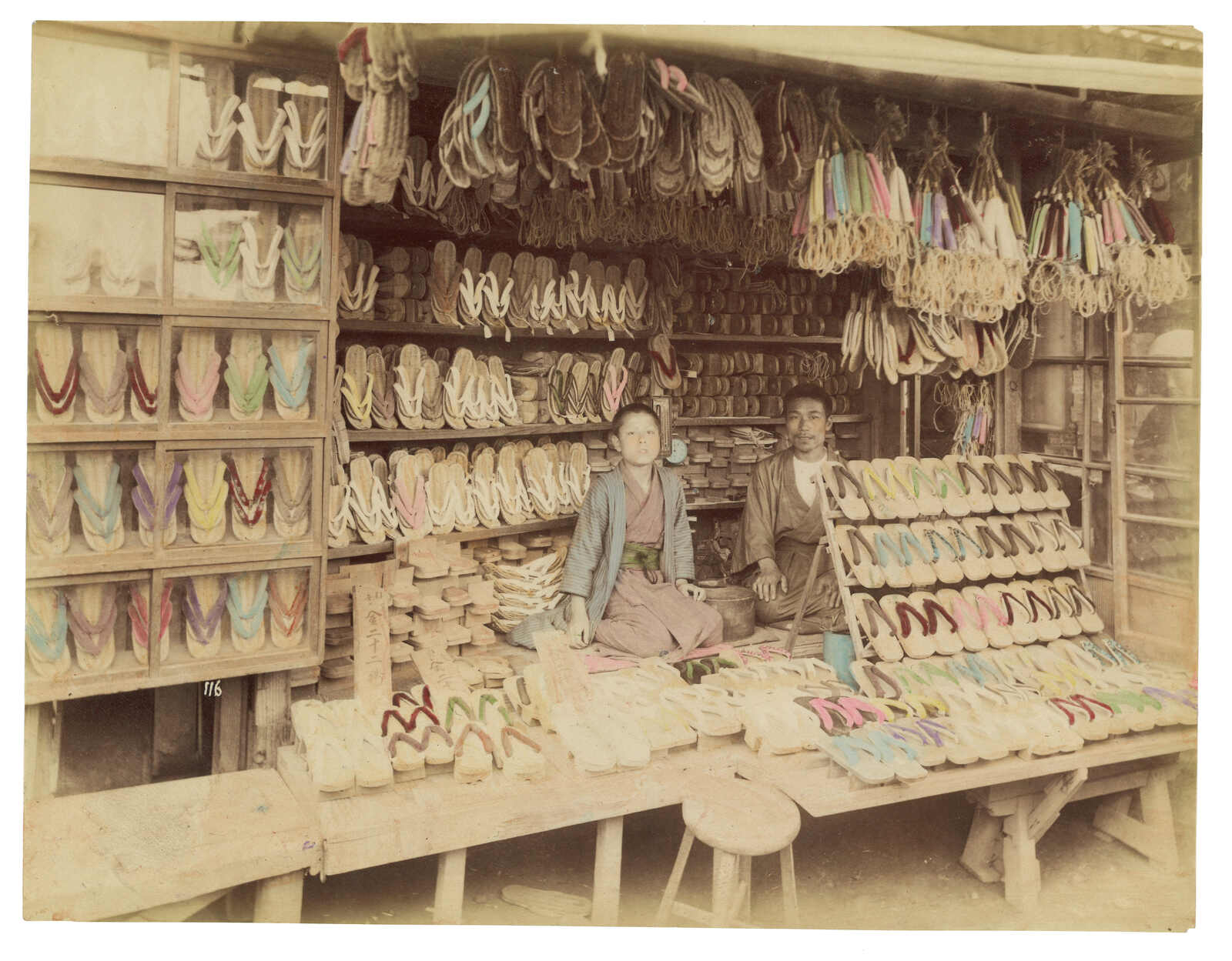 2545 imageA pair of Japan view albumen silver print photos, depicting shoe sellers and landscape respectively. (27x 20 cm).