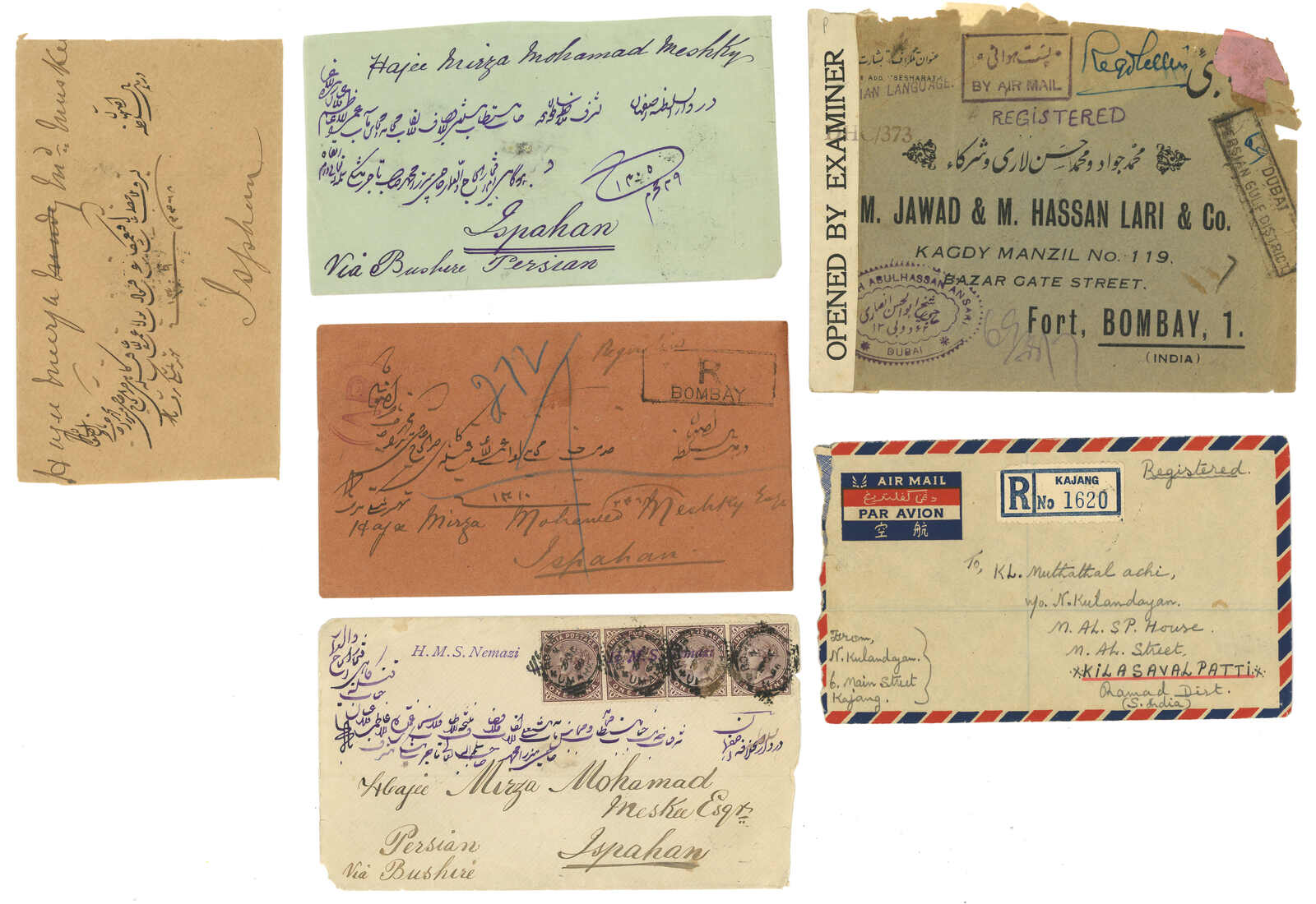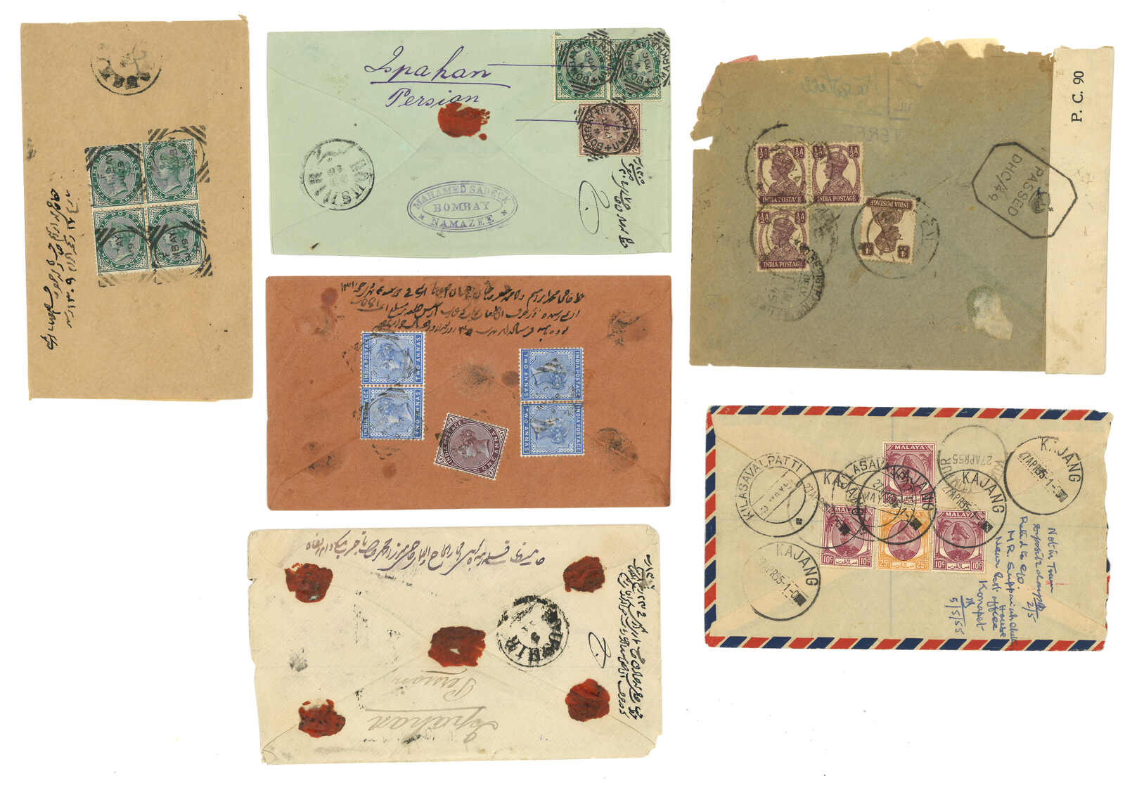 819 cover image1890-1950s an assorted group of 6 Indian domestic and international covers, including cover of HMS Nemazi, incoming cover from Malaya and WWII censor cover from Dubai. Please view.