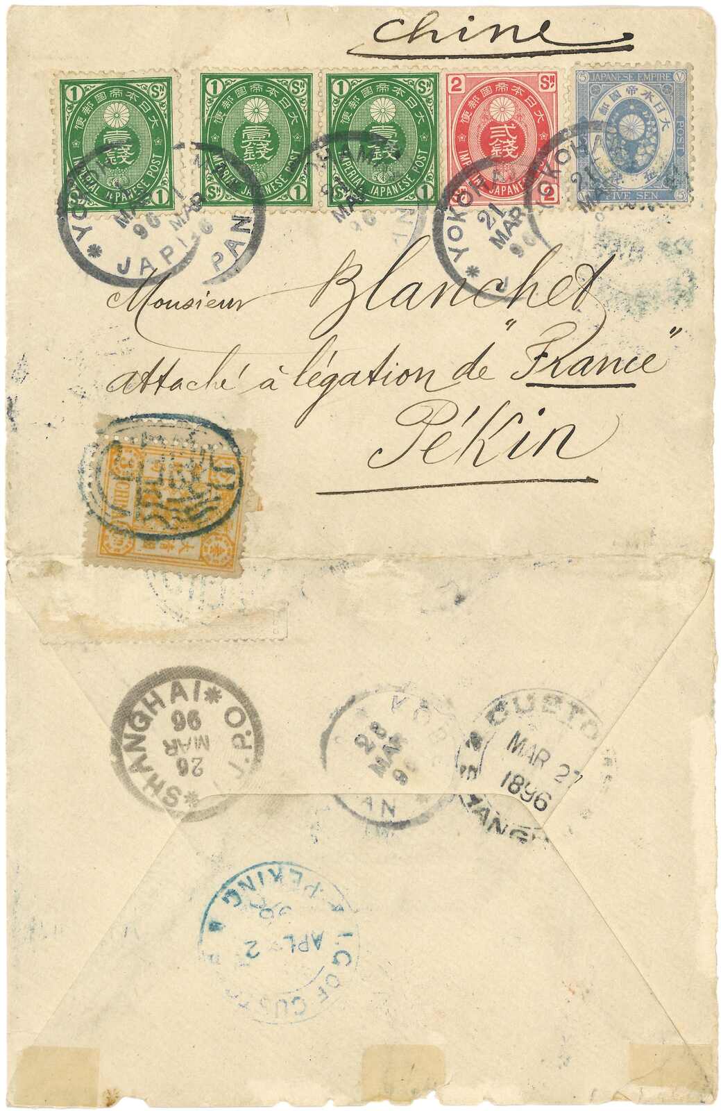 66 cover image1896 Japan (21 Mar) to French Legation in Peking, f.w. Koban x5, in total of 10s, tied by Yokohama cds. Transit IJPO Shanghai (26 Mar). In combination with Empress Dowager 3ca, tied by Shanghai seal script h.s, matching with Customs Shanghai (27 Mar) cds. Arrived Customs Peking (2 Apr). Cover opened out for display. Illustration A-1 896-039, p. 252 in "Covers and Cards of Empress Dowager Jubilee and its Surcharged Issues" Vol I by Tony To Wah Kwan.