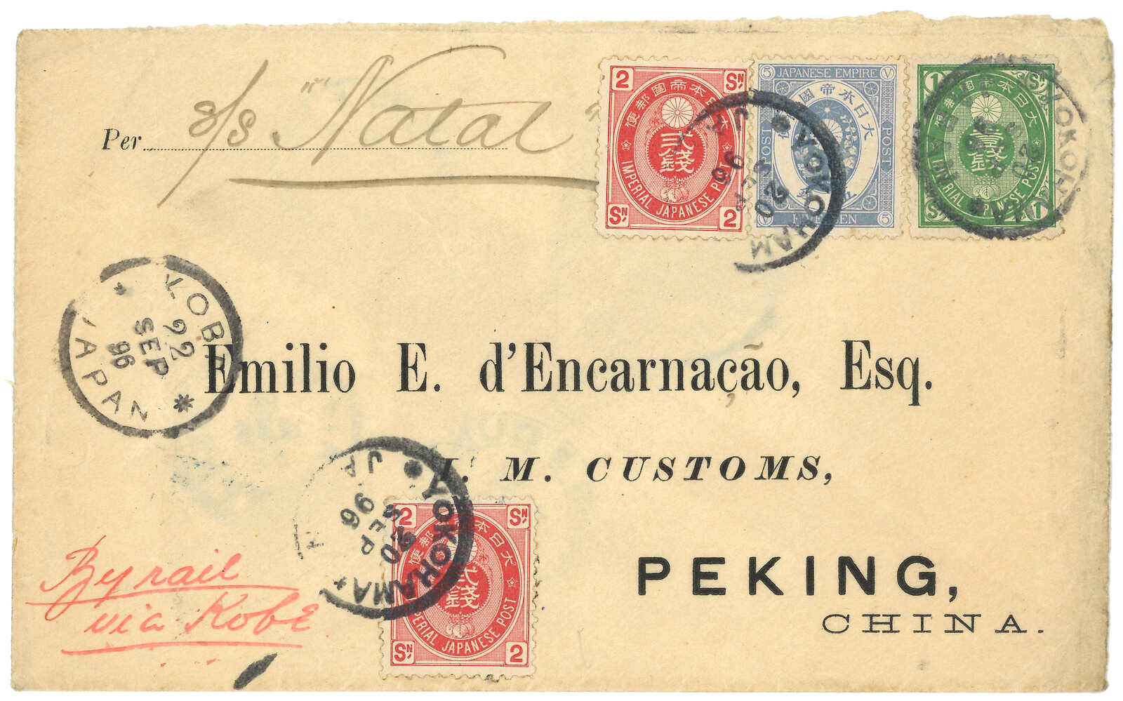 67 cover image1896 Japan (20 Sep) to E.E. Encarnacao, Customs Peking, f.w. Koban 1s + 2x 2s + 5s, tied by Yokohama cds in English. Showing "Per S/S Natal". Transit IJPO Shanghai (29 Sep). In combination with Empress Dowager 3ca, tied by Shanghai seal script h.s, matching with Customs Shanghai (29 Sep) cds. Arrived Customs Peking (5 Oct).