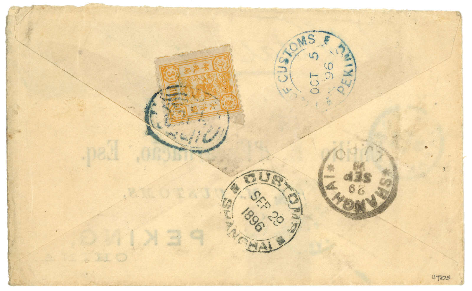 1896.9.20 日本寄北京海關E E Encarnacao,貼小判3枚合10錢,銷橫濱英文日戳。9.29經上海日局。加貼慈壽3分銀,銷上海篆文戳,另鈐上海海關9.29日戳。10.5抵北京海關。(Image 1) (Image 2)