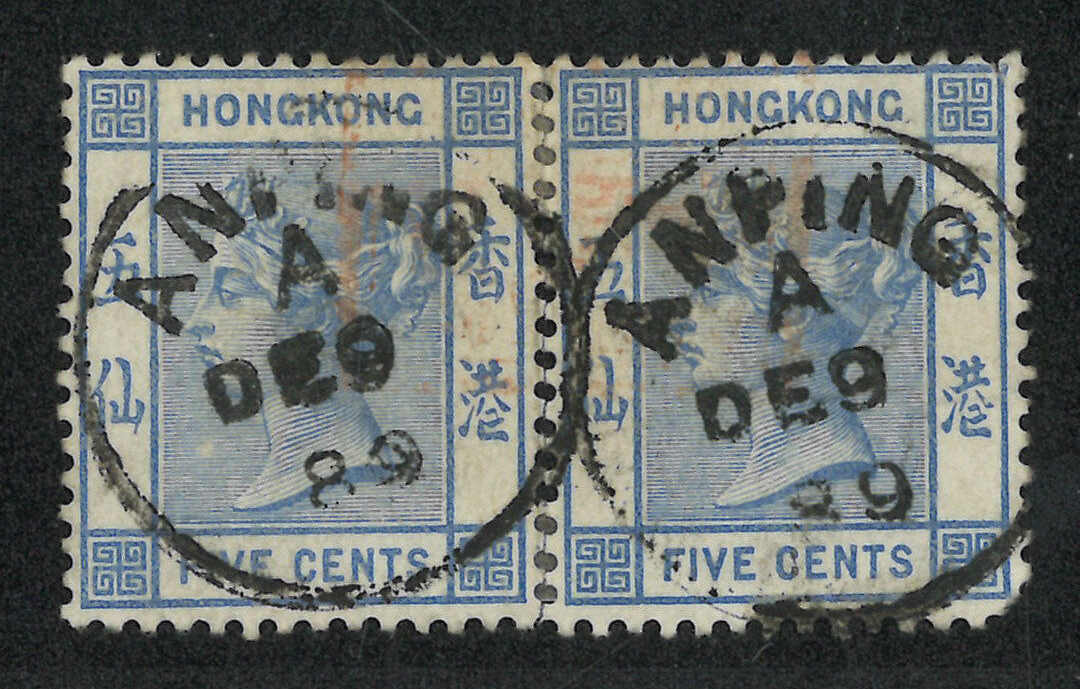 3046 o image1889 (9 Dec) Hong Kong QV 5th issue wmk CA 5c in horizontal pair (Yang 34), tied by scarce Anping BPO Webb type A cds. Webb recorded only about 36 stamps applied with this cancellation. Illustration plate 36 in "The Philatelic Postal History of Hong Kong and the Treaty Ports of China and Japan" by F W Webb.