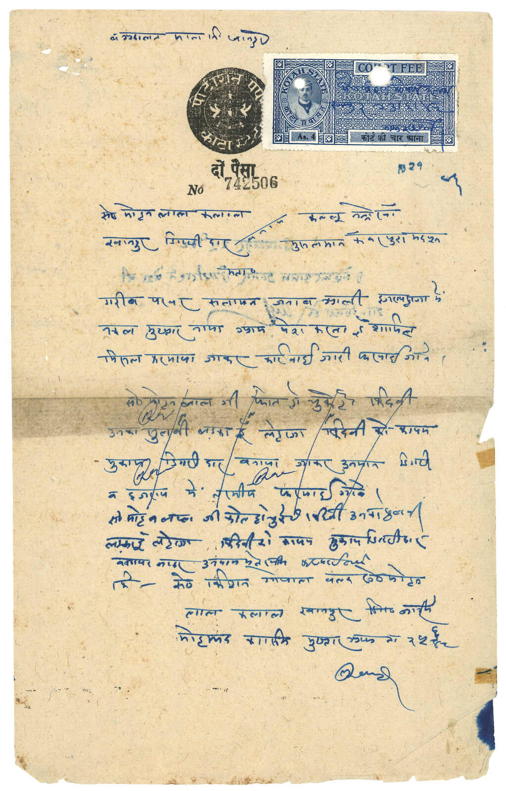 印度法庭文件一份,貼科塔土邦法庭印花票。(Image 1) (Image 2)