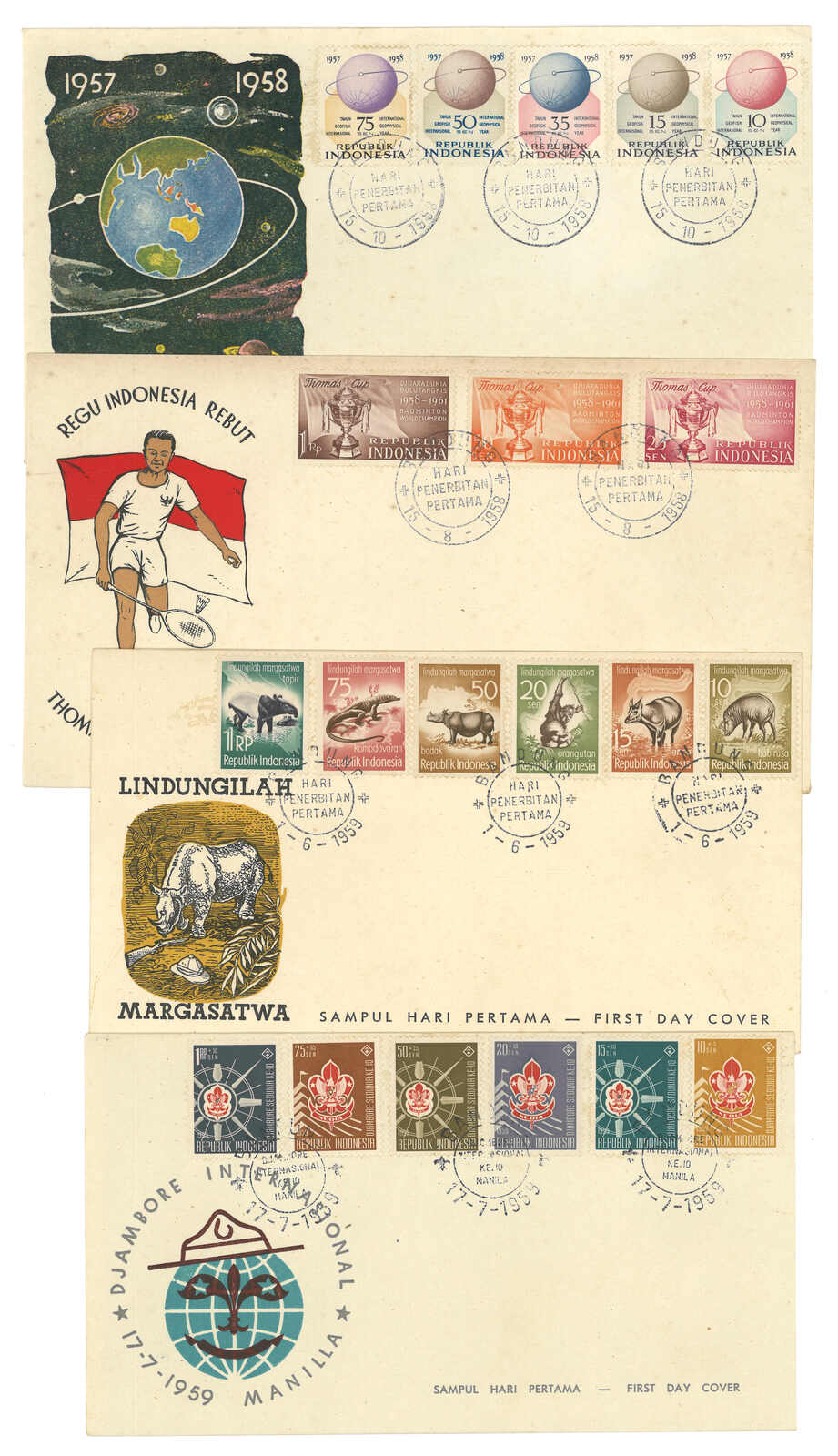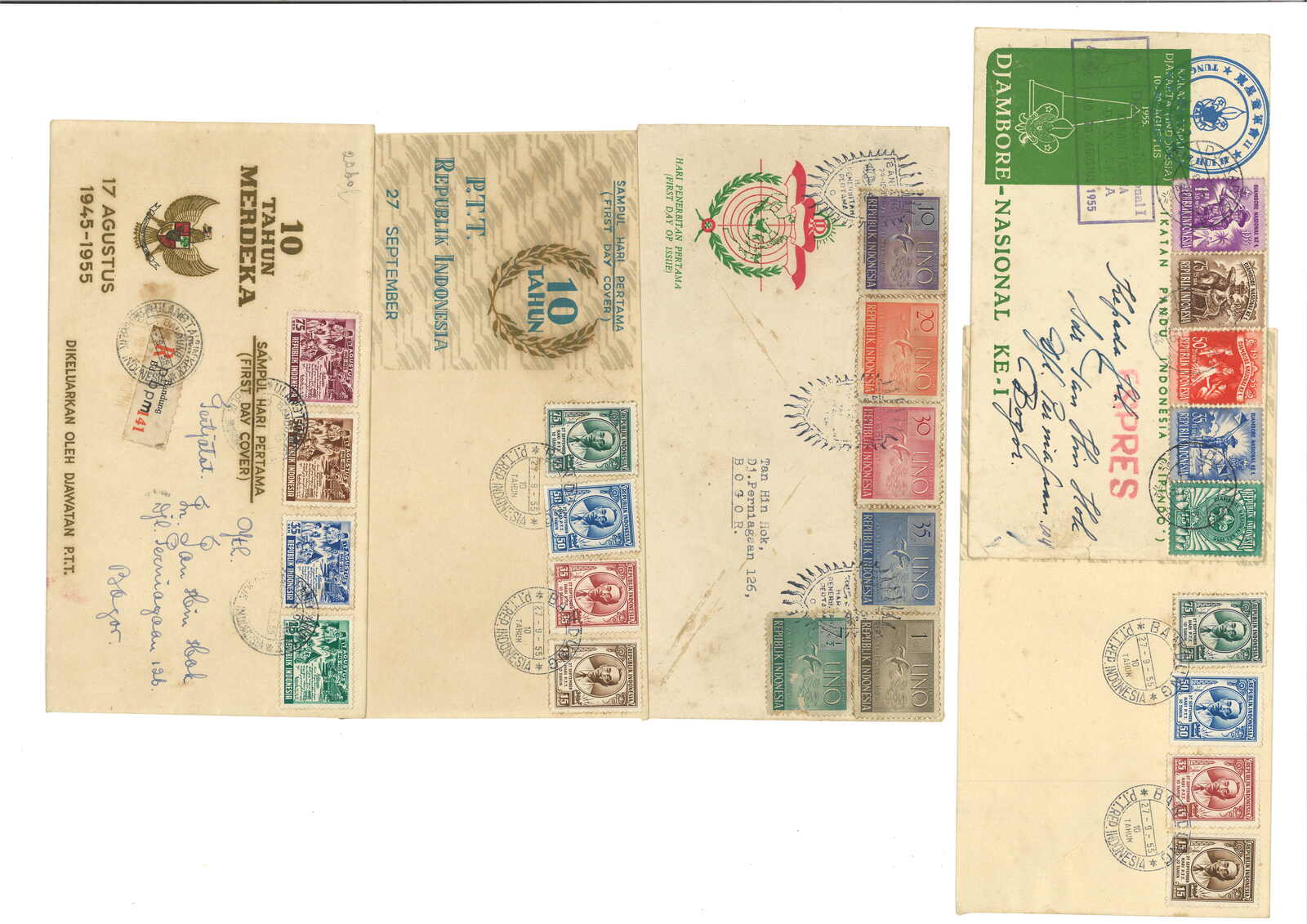 1950至1960年代一組約200件印尼首日封,整齊置於數本郵冊中,包含聯合國六週年等,部分實寄,請預覽。(Image 1) (Image 2) (Image 3) (Image 4) (Image 5)