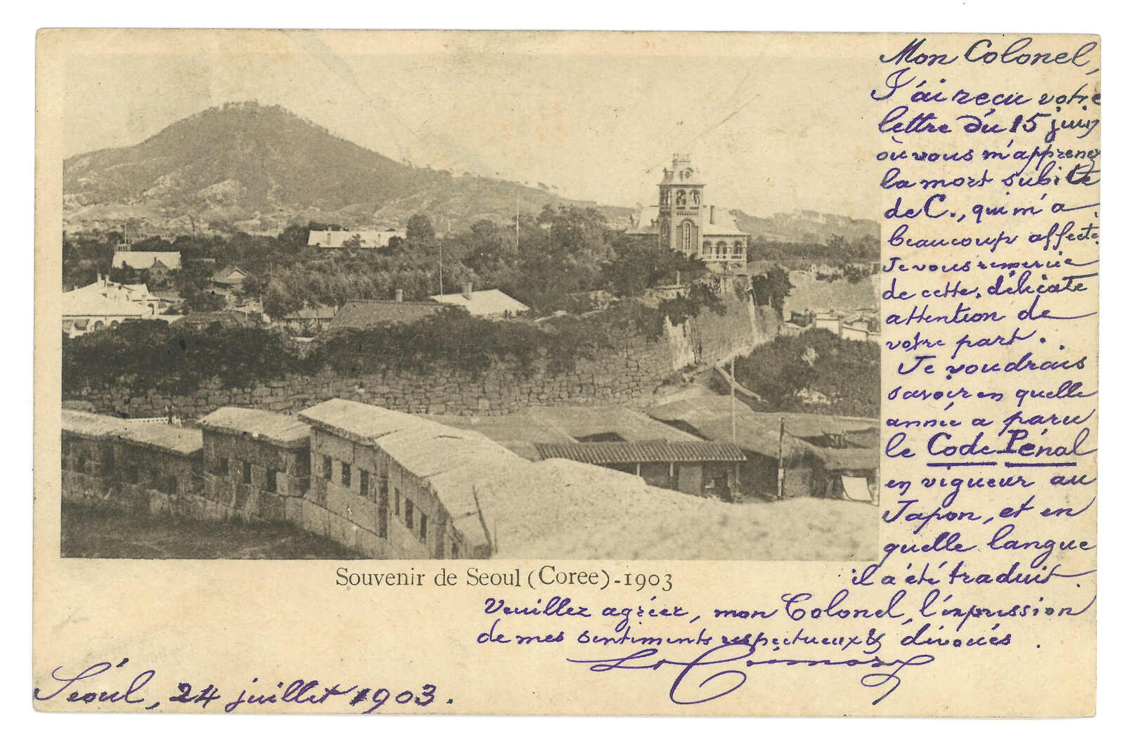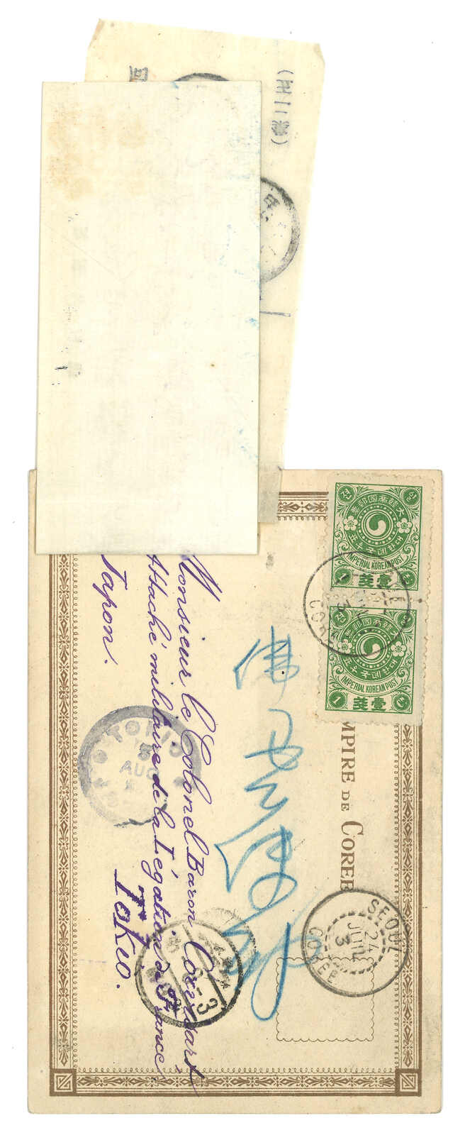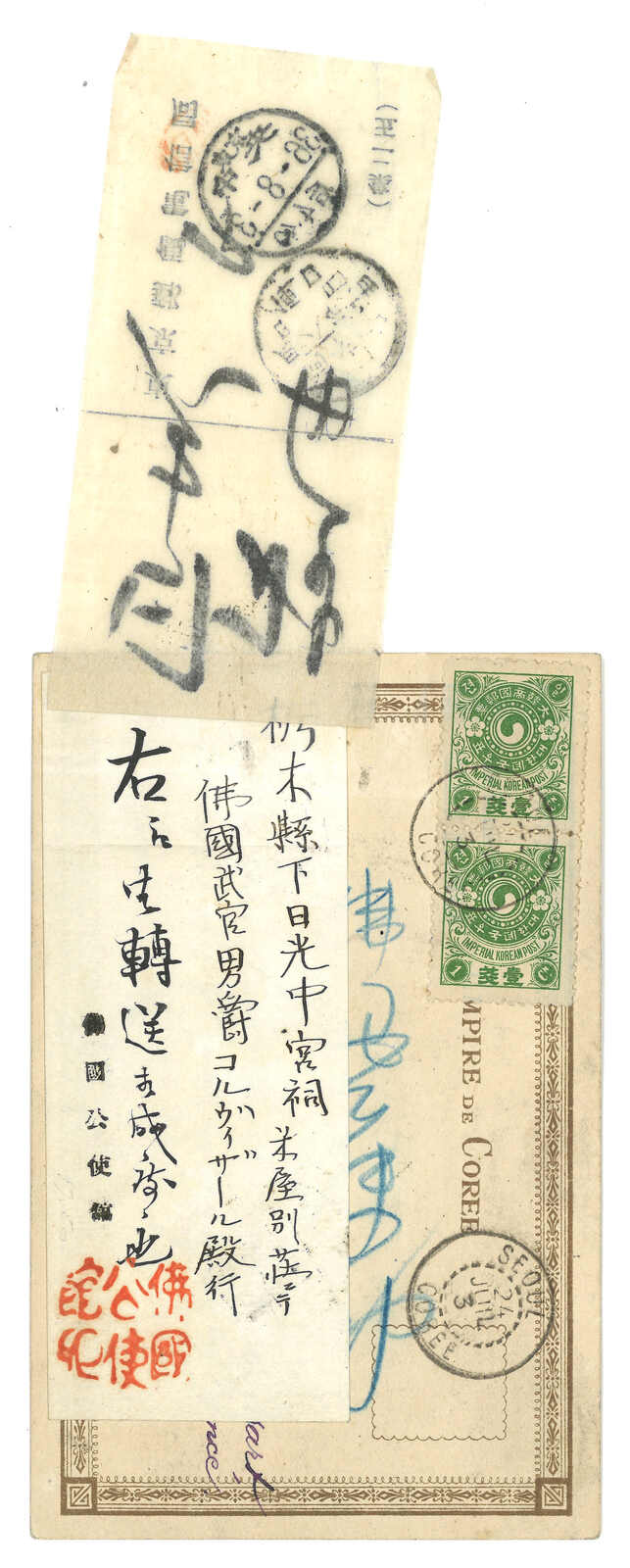 1903.7.24 漢城寄法國駐日本公使館,退回寄件人。圖片明信片,貼梅花1錢雙連,合寄日本第二次特別郵資,銷漢城法文日戳。8.3抵東京但送遞失敗。8.5退回。貼有退件憑單。(Image