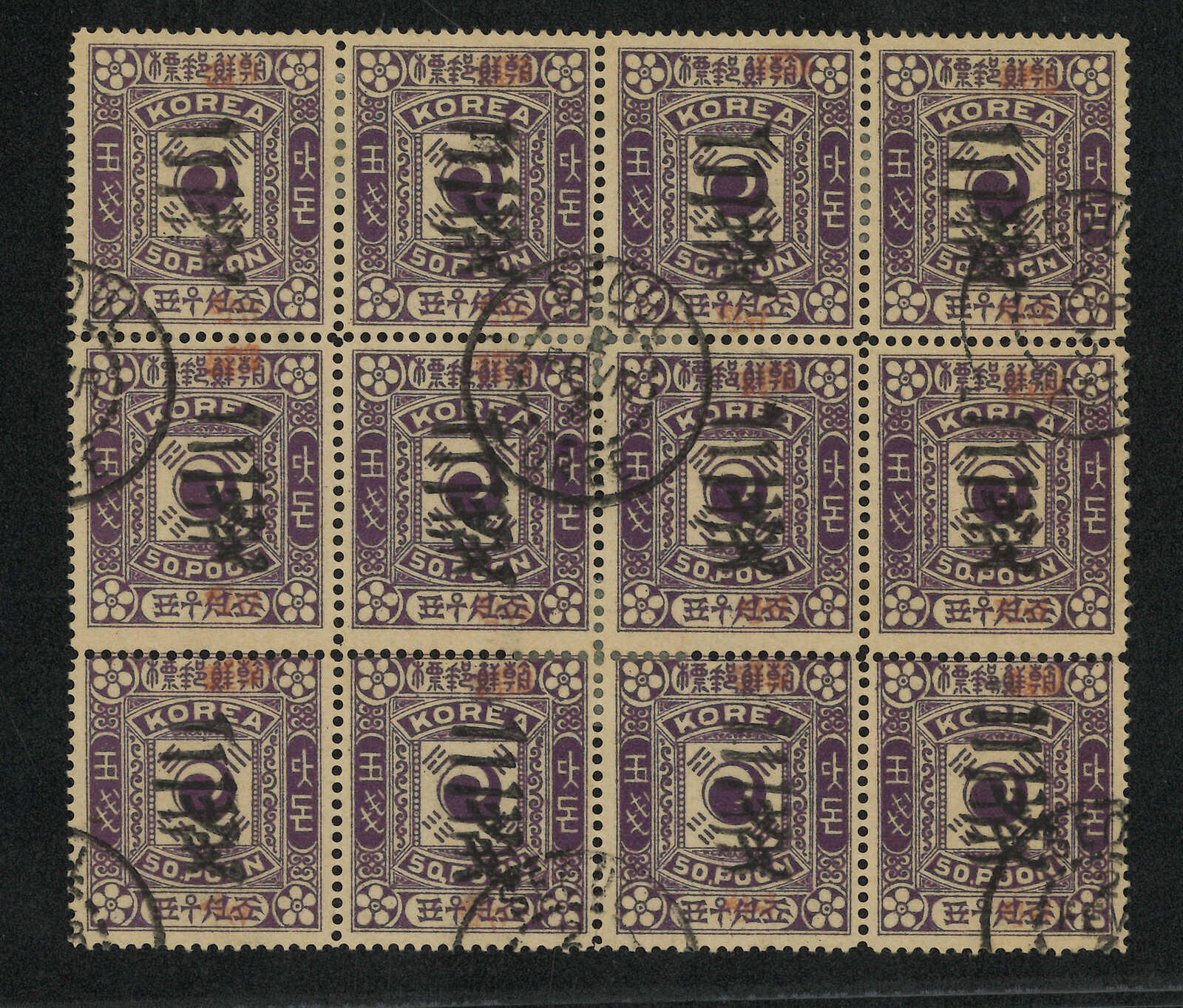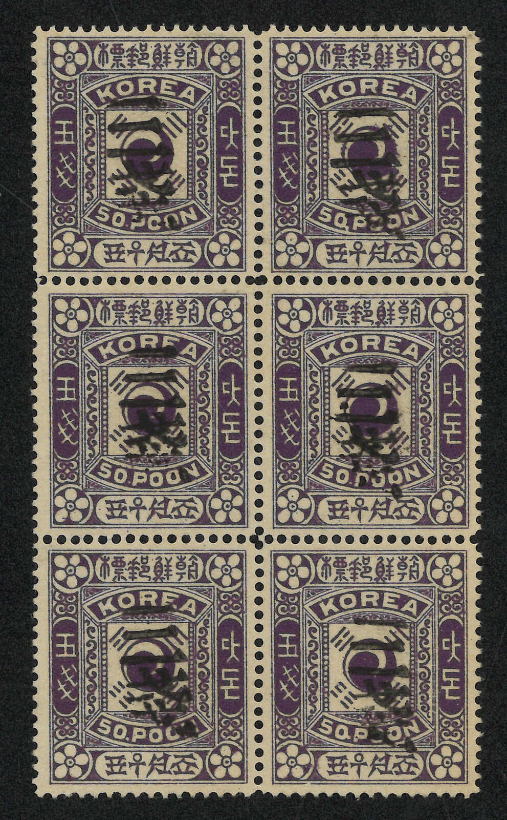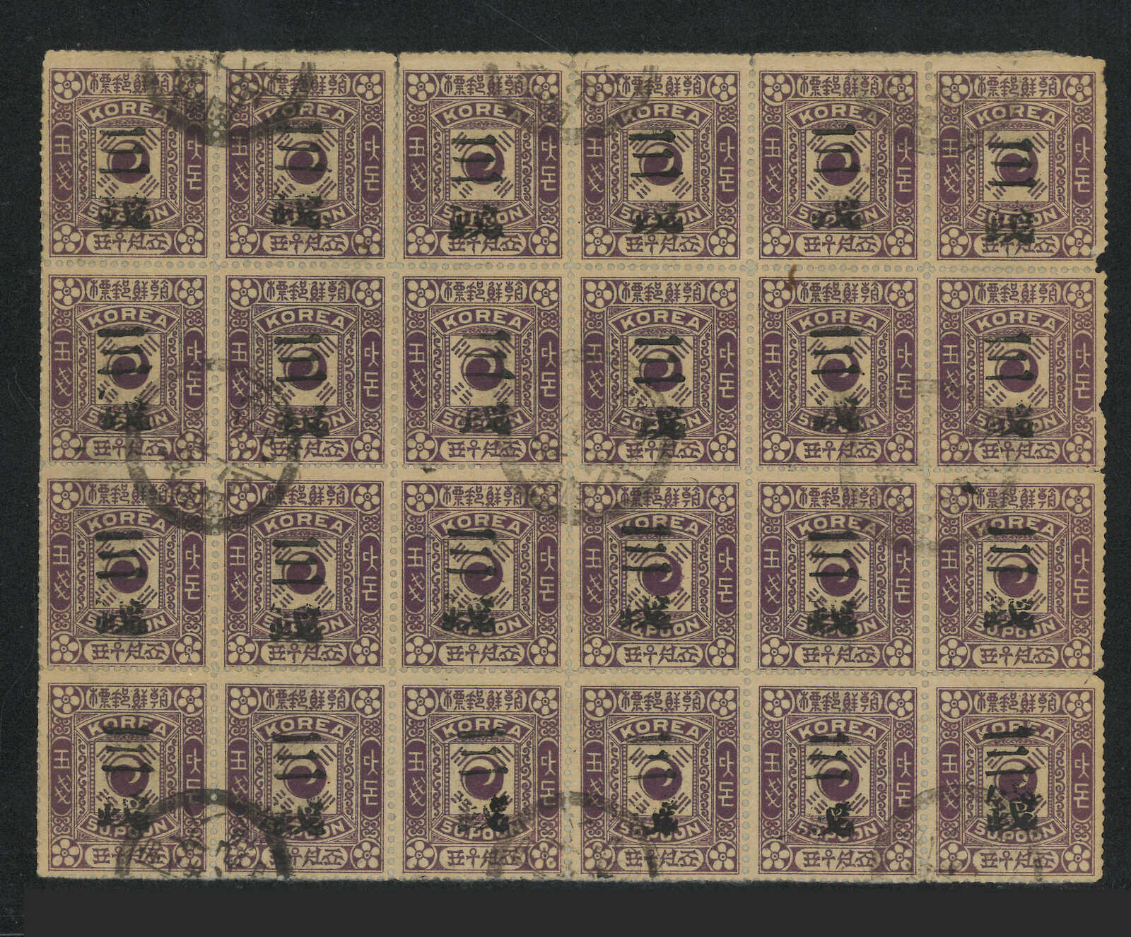 1901-1903 Taegeuk metal type surch 3 Cheon (三錢) on 50 Poon in block of 24 (KPDA 31), used and hinged with paper on reverse.. It is the largest known used block according to Holcombe. With Peter Holcombe certificate. Overprint