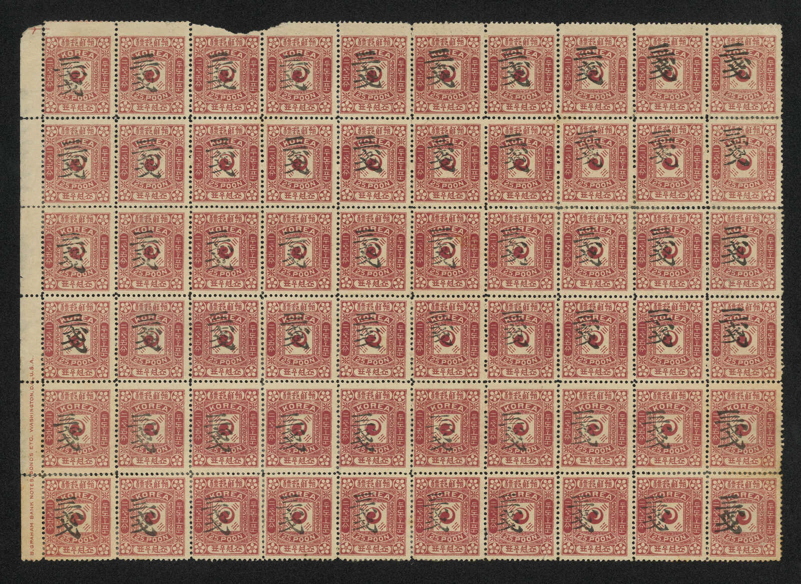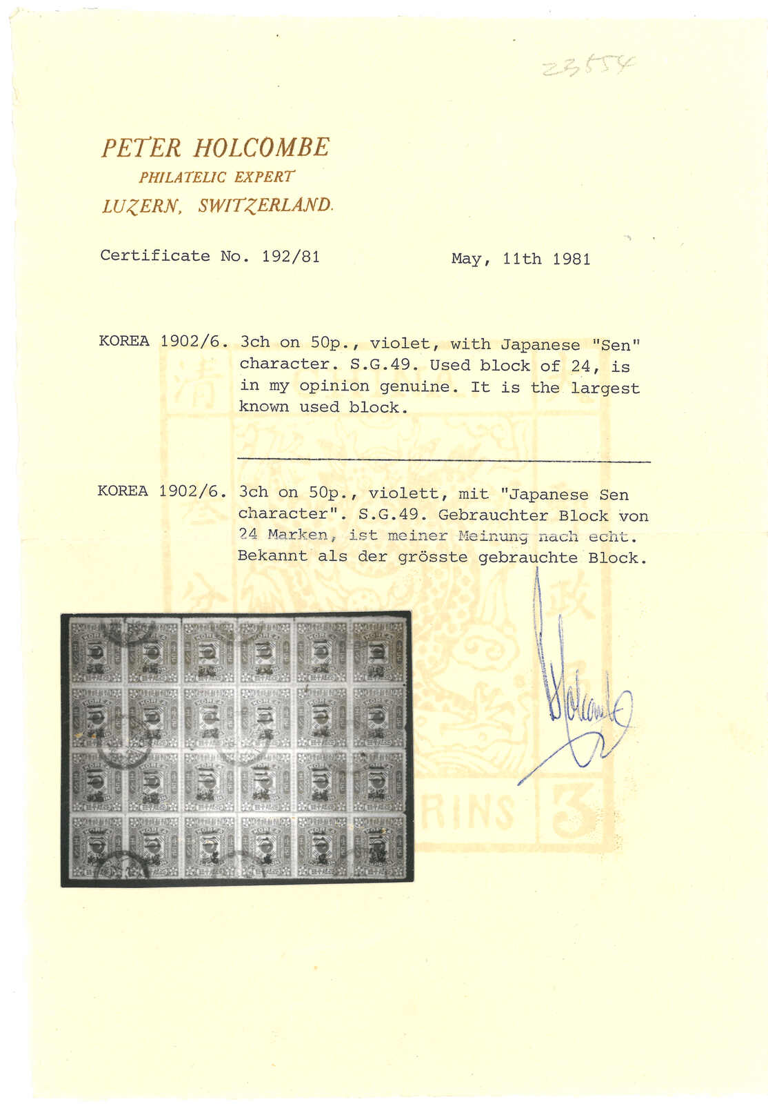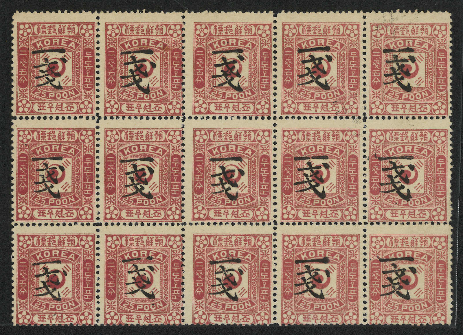 1901-1903 Taegeuk metal type surch 3 Cheon (三錢) on 50 Poon in block of 24 (KPDA 31), used and hinged with paper on reverse.. It is the largest known used block according to Holcombe. With Peter Holcombe certificate. Overprint