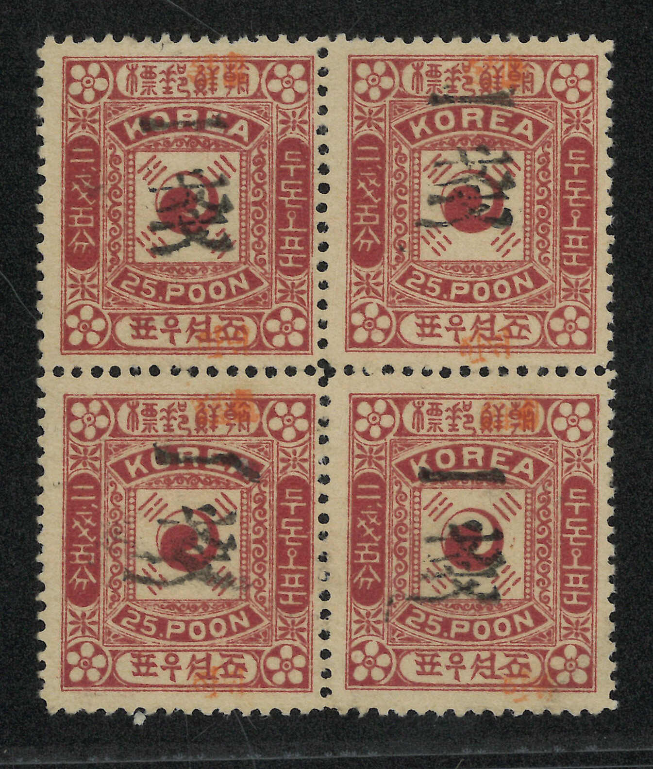 1901-1903 Taegeuk metal type surch 1 Cheon on 25 Poon in block of 4 (KPDA 28). MH.