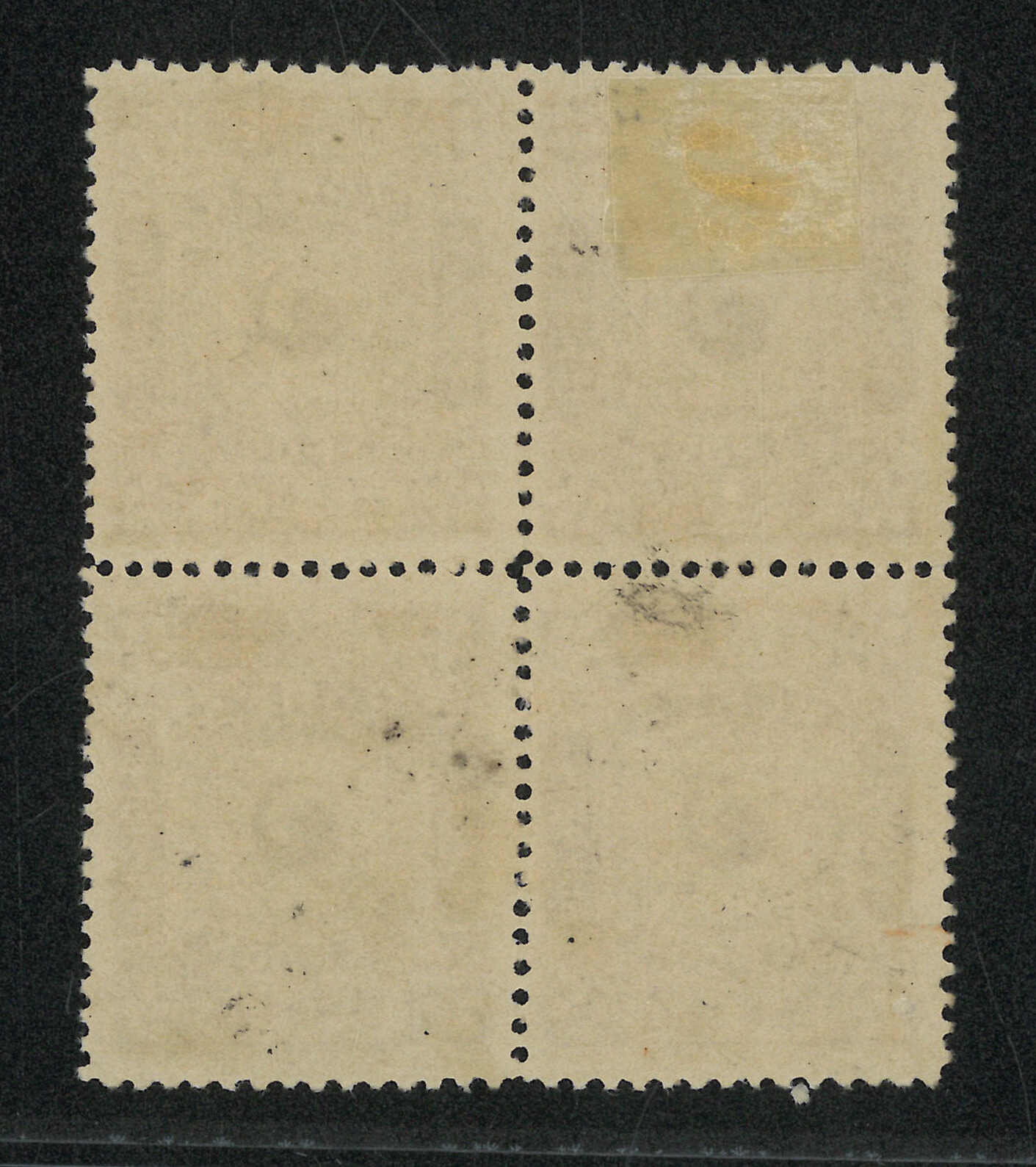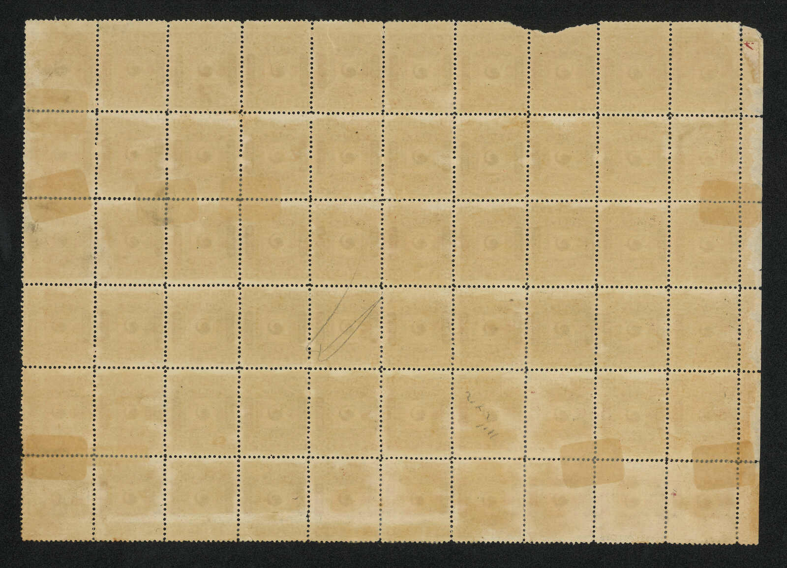 1901至1903年太極圖木戳加蓋“三戔”於2錢5分六十方連(KPDA 30A),背貼,部分齒孔斷開或短齒。(Image 1)
