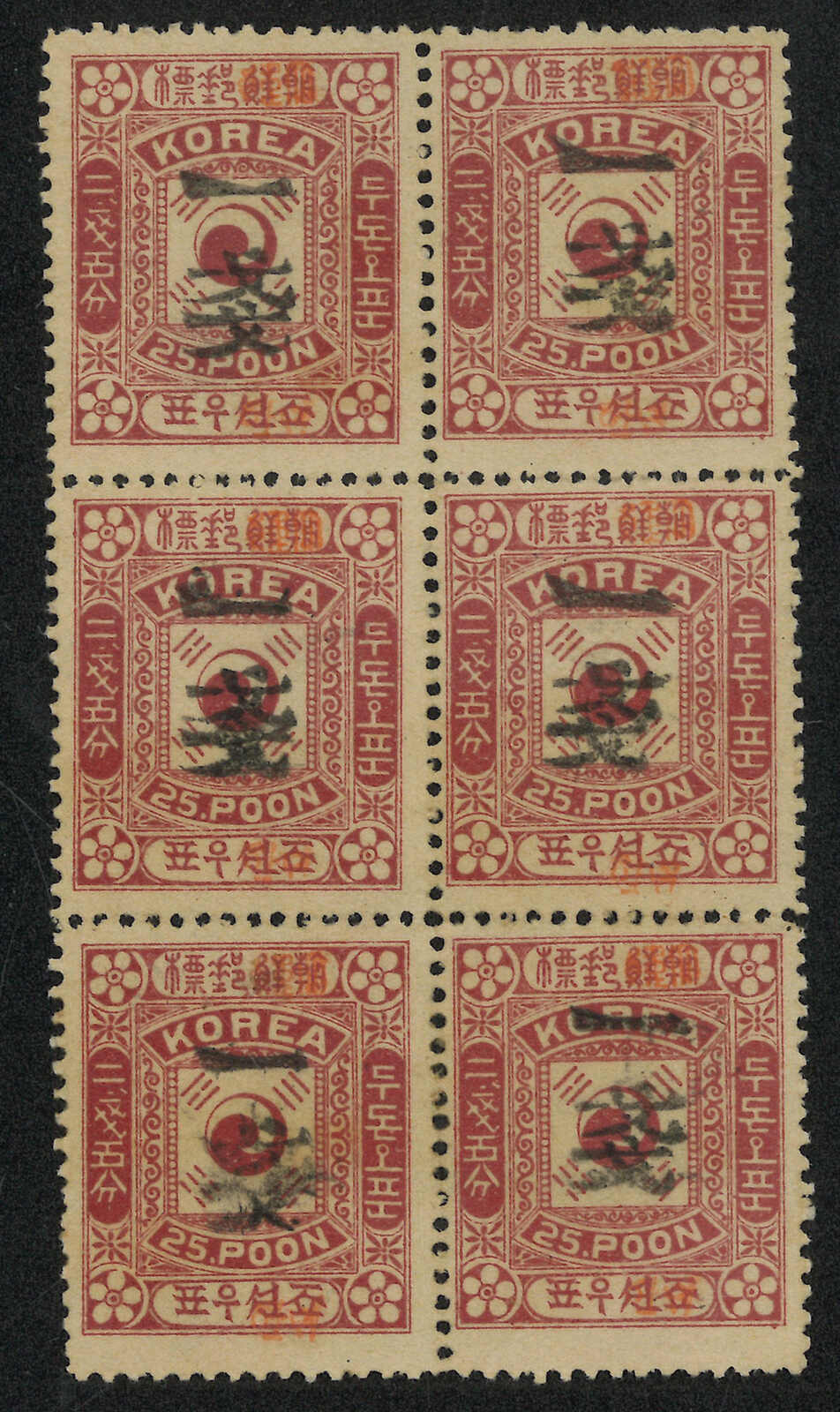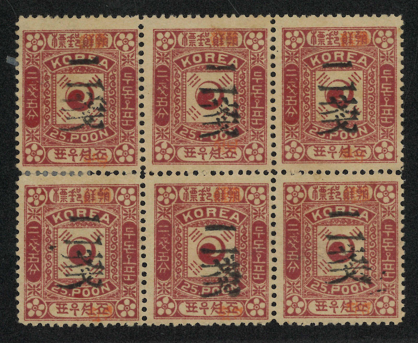 1901-1903 Taegeuk metal type surch 2 Cheon on 25 Poon in block of 6 (KPDA 29). MLH.