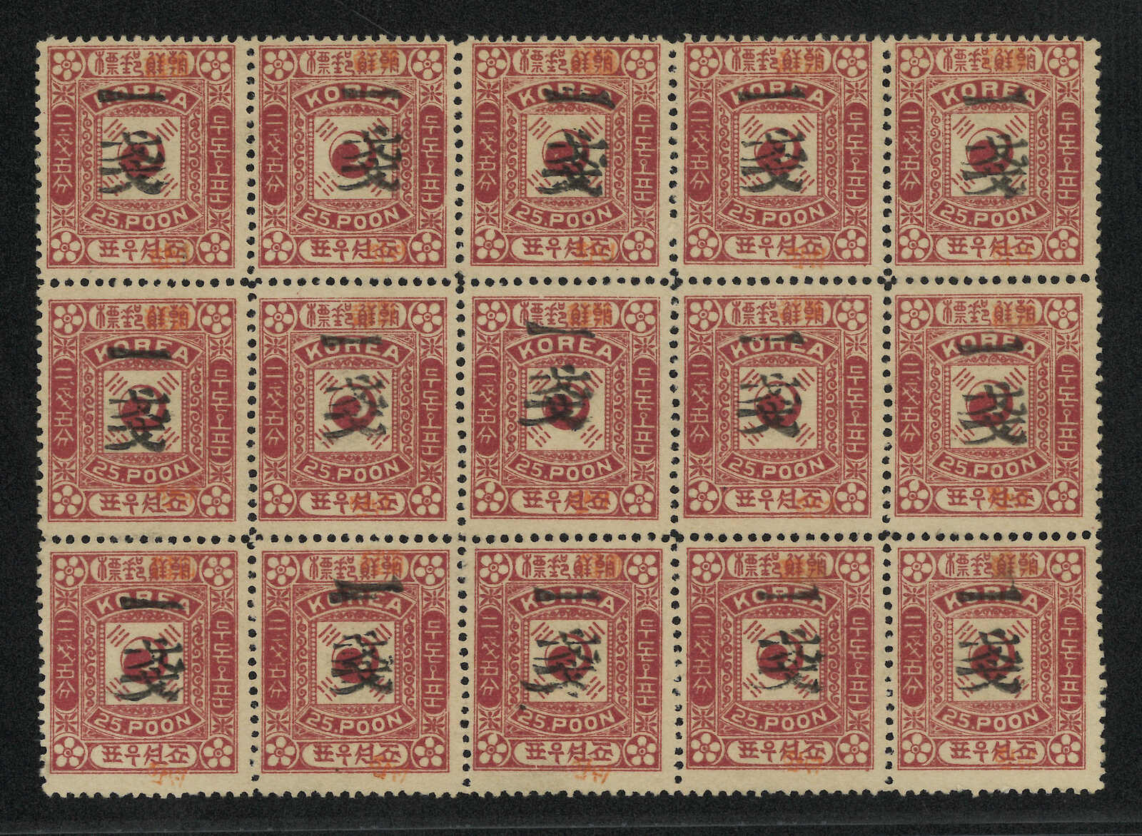 1901-1903 Taegeuk woodchop surch 1 Cheon on 25 Poon in block of 15 (KPDA 28B), MNH.